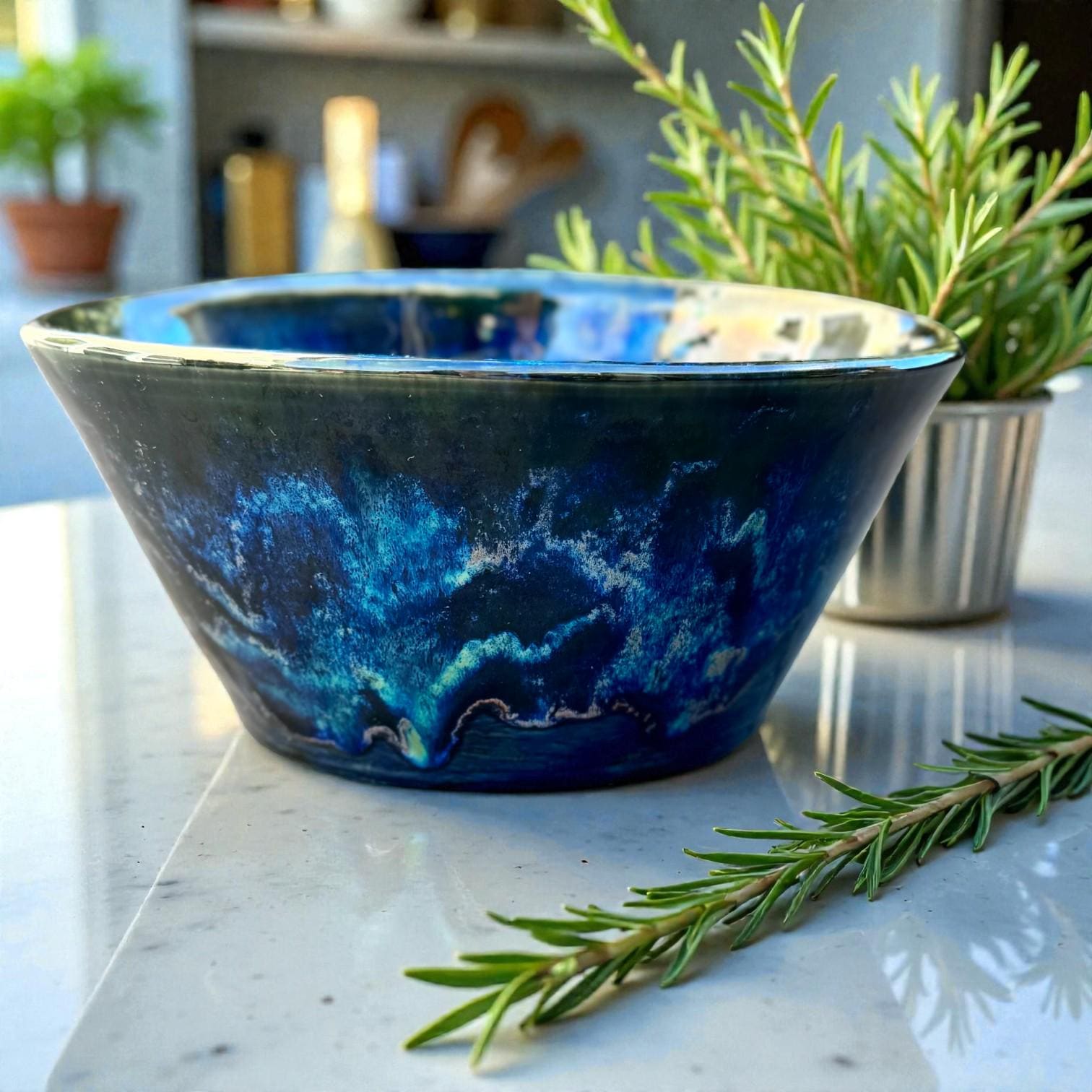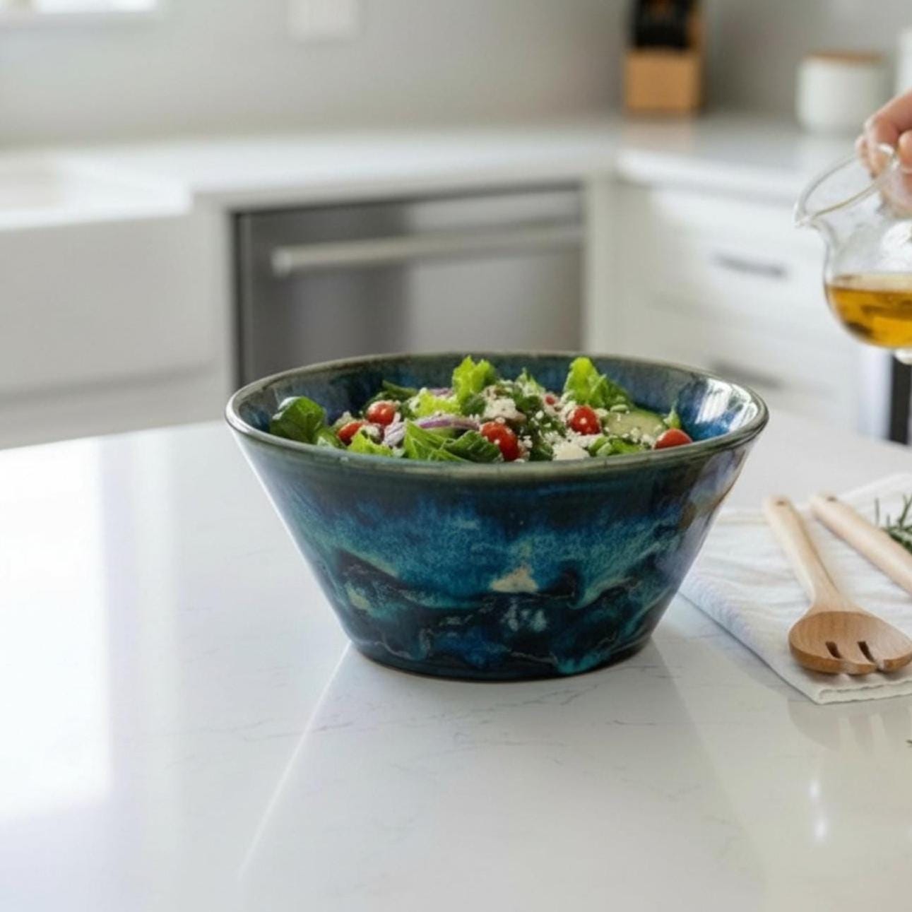 Add a rich, moody touch to your kitchen or table with this handmade white stoneware bowl. Wheel-thrown and finished in layered blue and green glazes, this piece has beautiful depth and movement that shifts in the light. A versatile size that works equally well as a serving bowl, prep bowl, or statement display piece.
