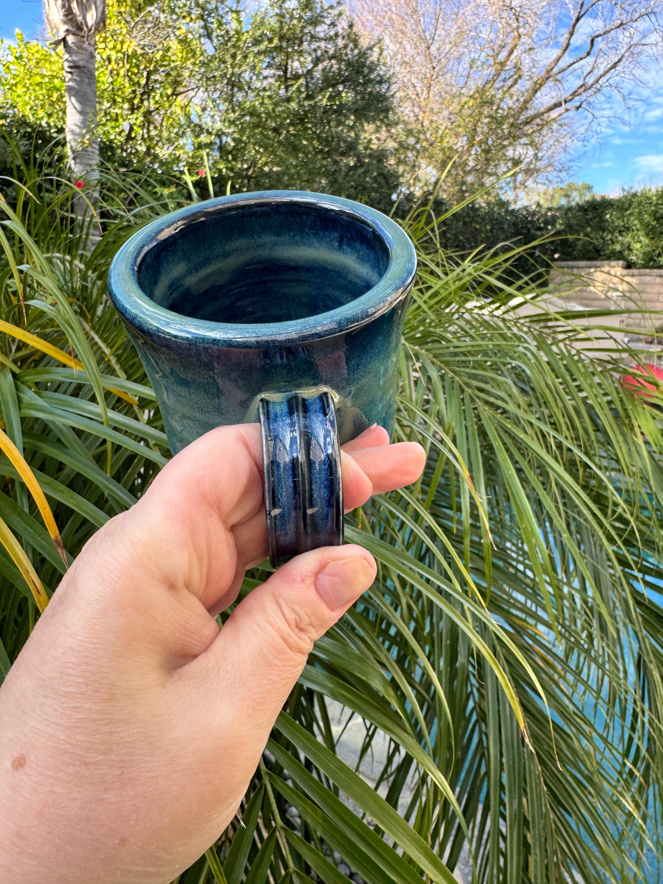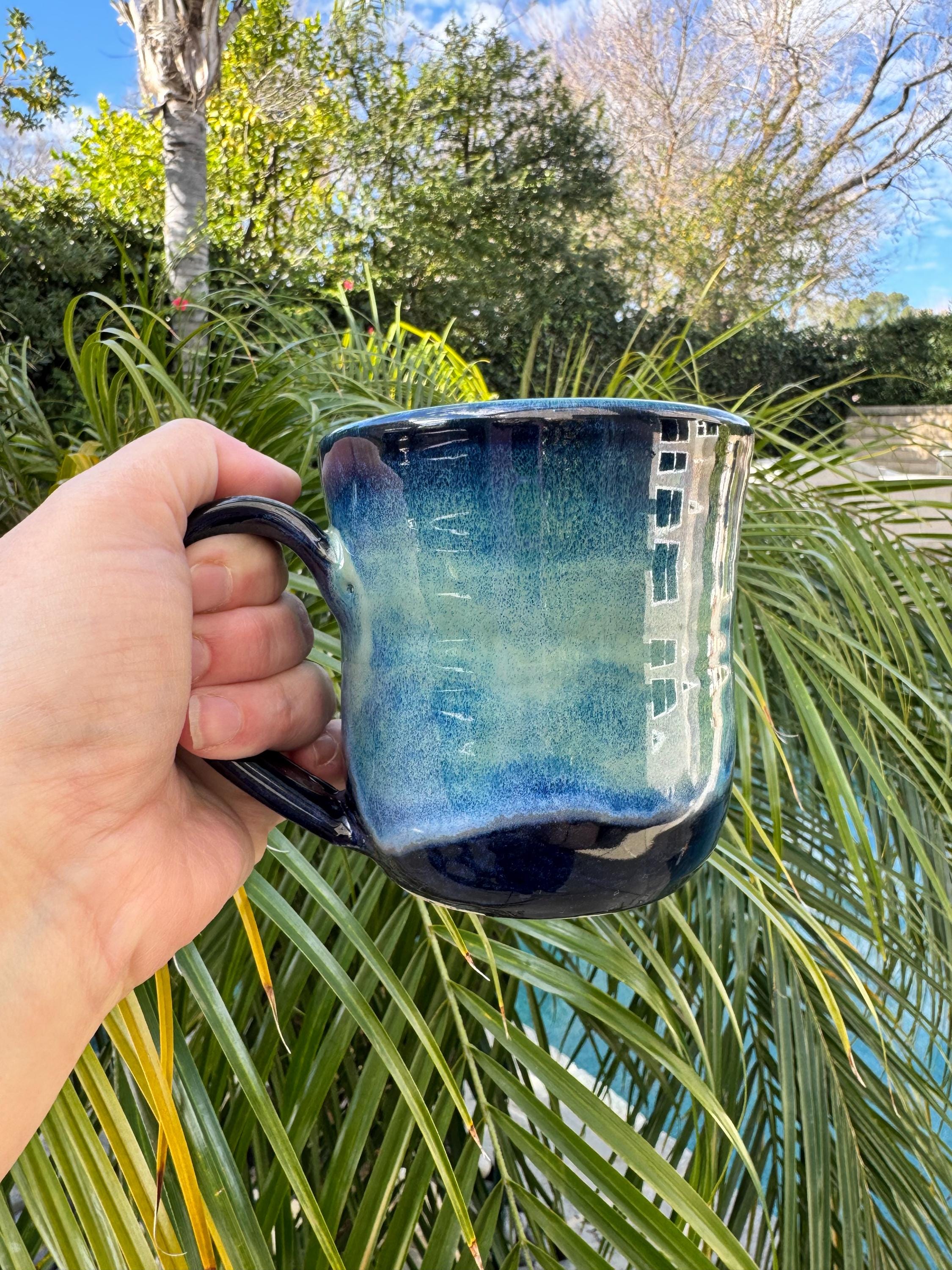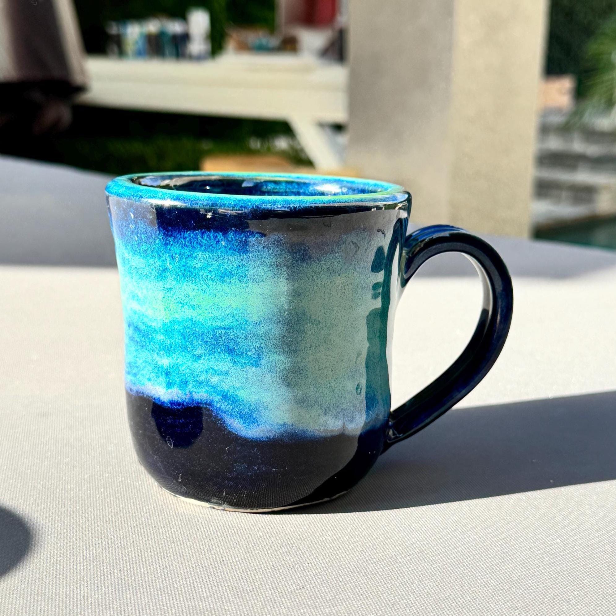 Features: ✔ Holds Approx 12 oz ✔ Approx 4” tall x 3.5” wide ✔ White stoneware clay body ✔ Ocean green to deep blue glaze inside and out ✔ Microwave & dishwasher safe (hand wash preferred) ✔ Durable, wheel-thrown stoneware