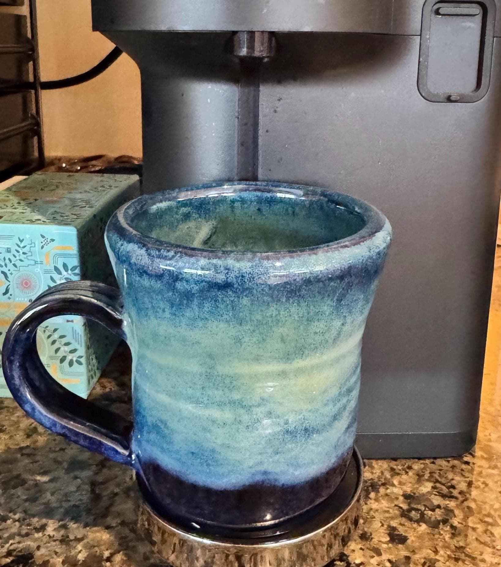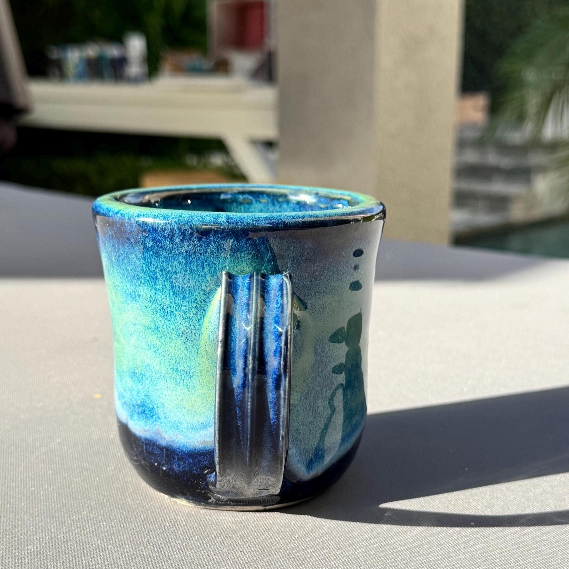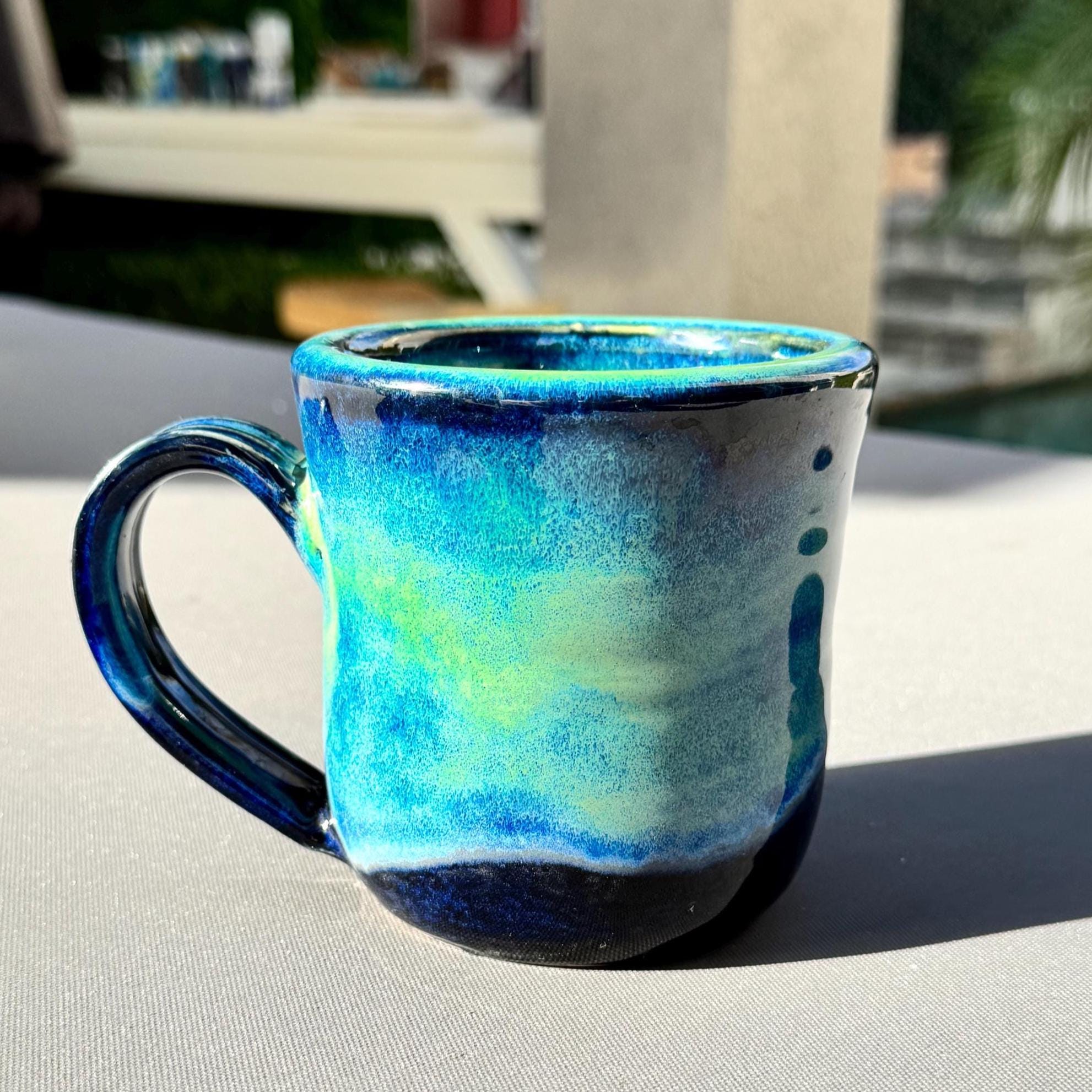 Features: ✔ Holds Approx 12 oz ✔ Approx 4” tall x 3.5” wide ✔ White stoneware clay body ✔ Ocean green to deep blue glaze inside and out ✔ Microwave & dishwasher safe (hand wash preferred) ✔ Durable, wheel-thrown stoneware