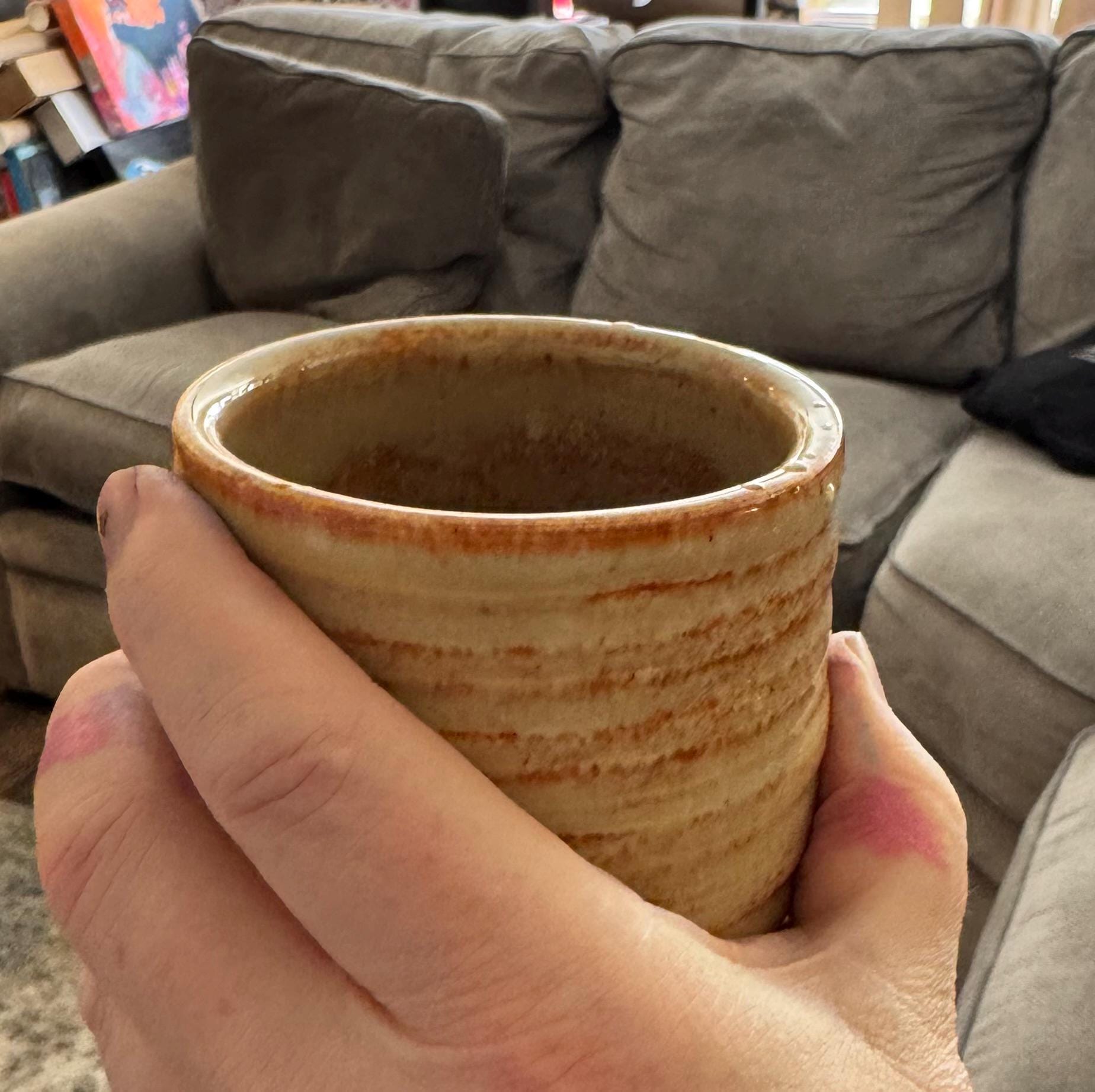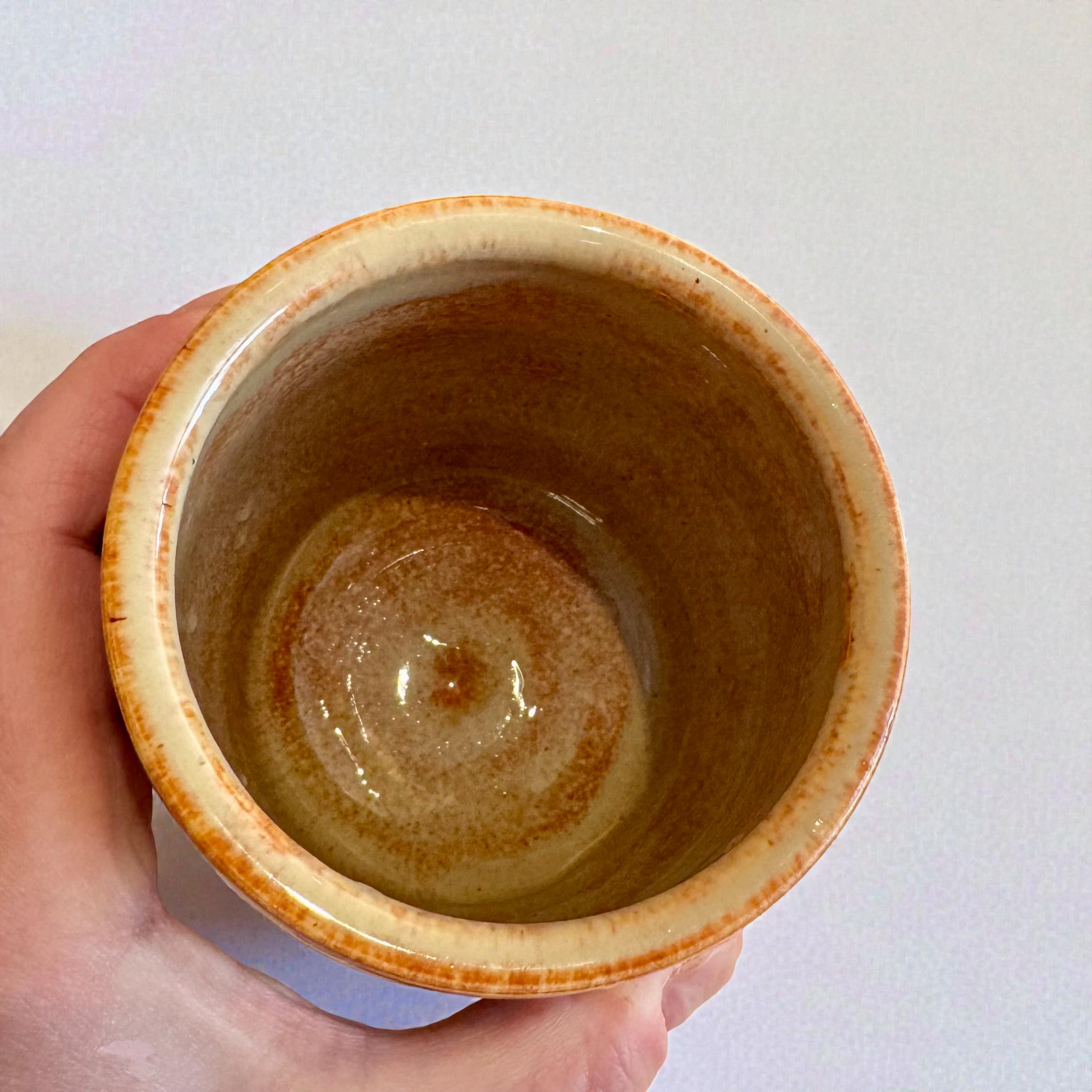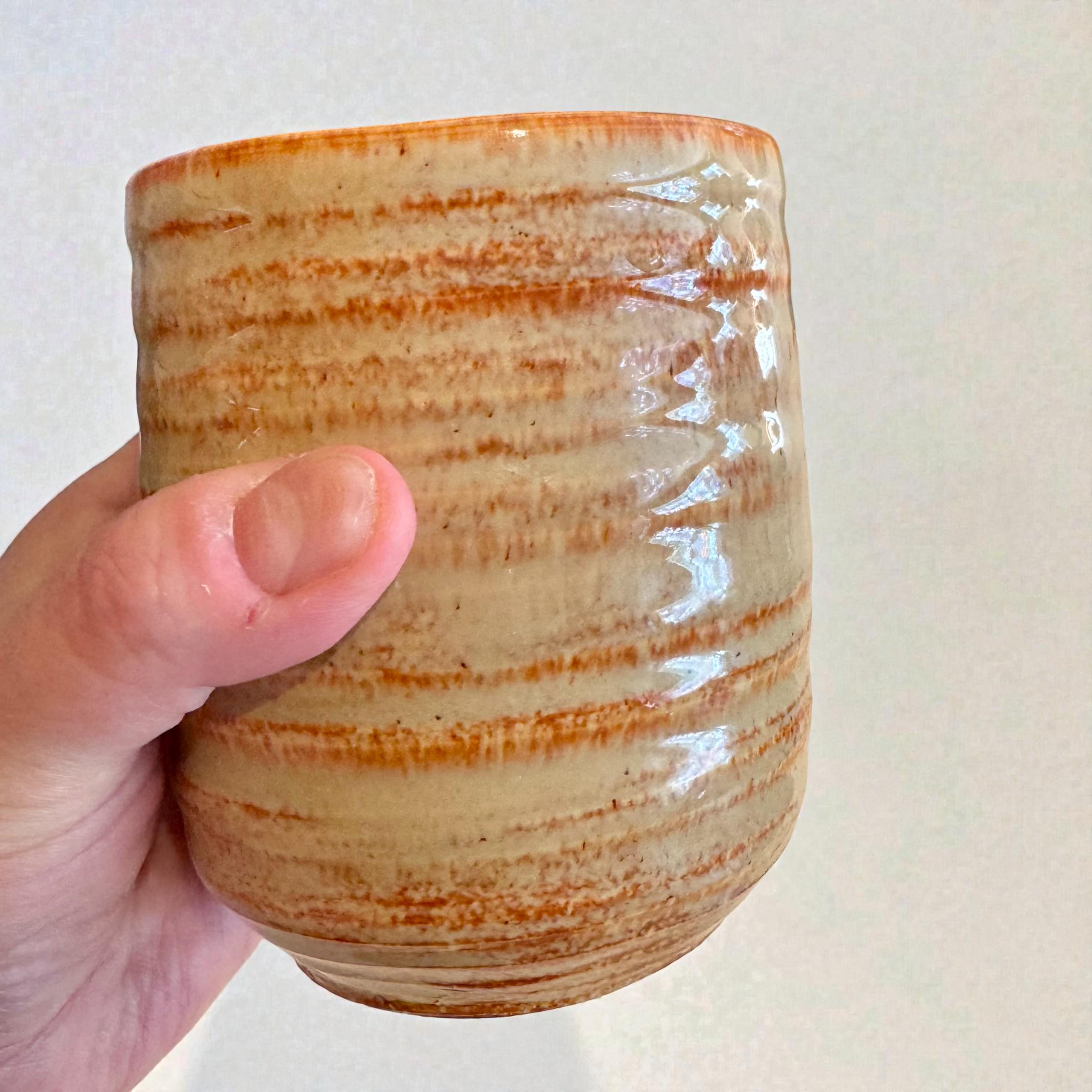 This one-of-a-kind ceramic tumbler is wheel-thrown from stoneware and finished with layered, earthy glaze tones that feel warm and grounding in the hand. Its slightly wider form and comfortable weight make it especially well-suited for an evening cocktail, whiskey, or wine—while still being perfect for coffee, tea, or everyday use.