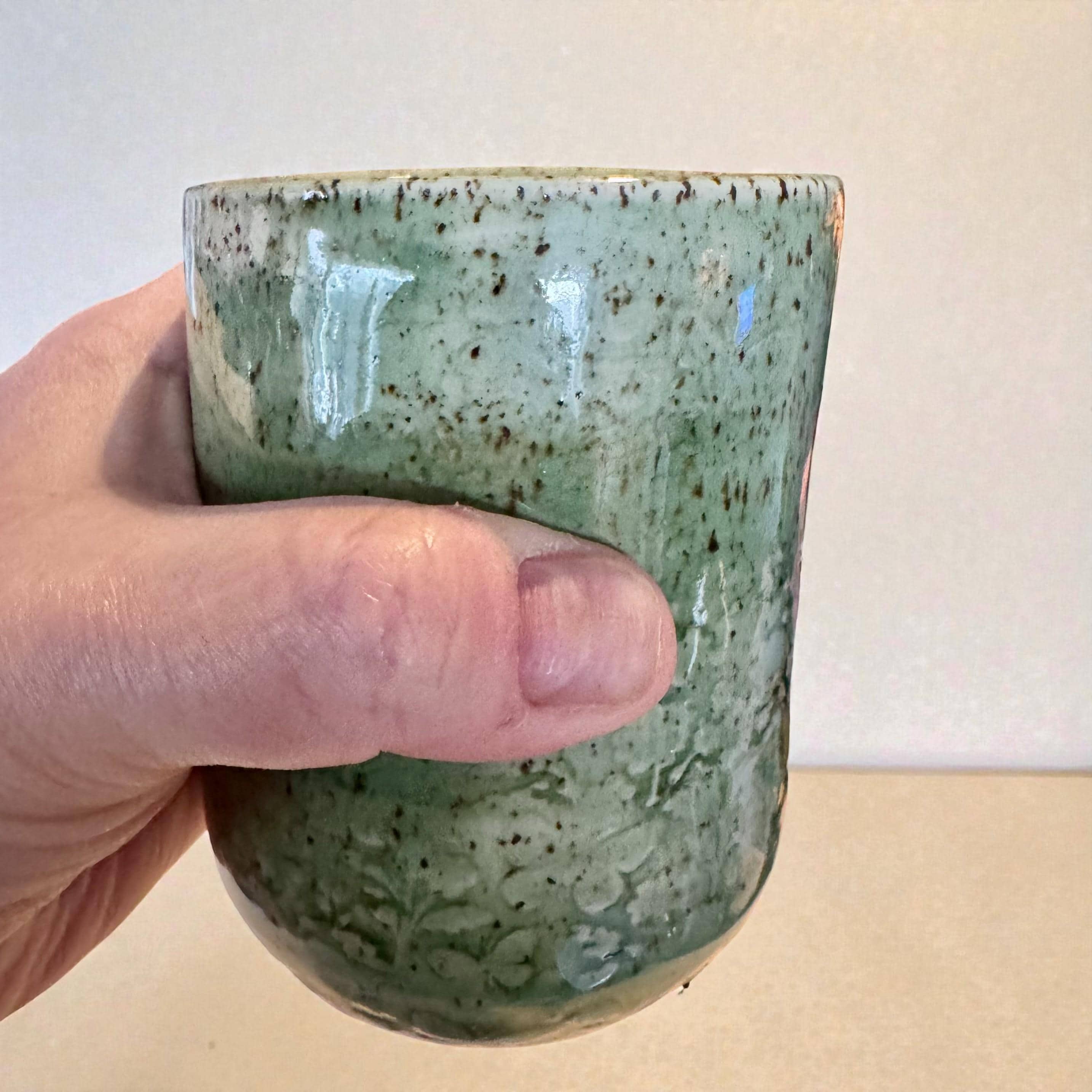 This small handmade ceramic tumbler features a soft, layered green glaze over speckled white stoneware, with a soft floral relief pattern applied to the surface, allowing the glaze to break beautifully over the raised design. The result is gentle depth and variation that highlights the handmade character of the piece without feeling busy or ornate.