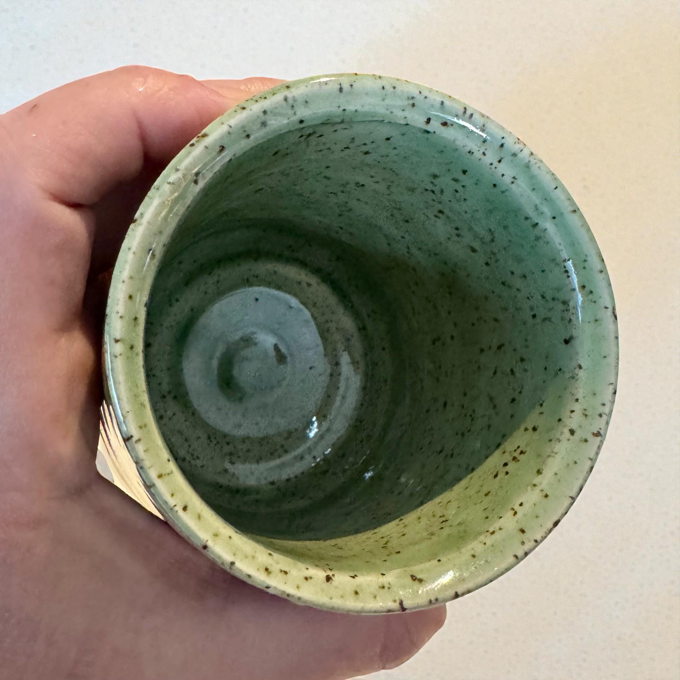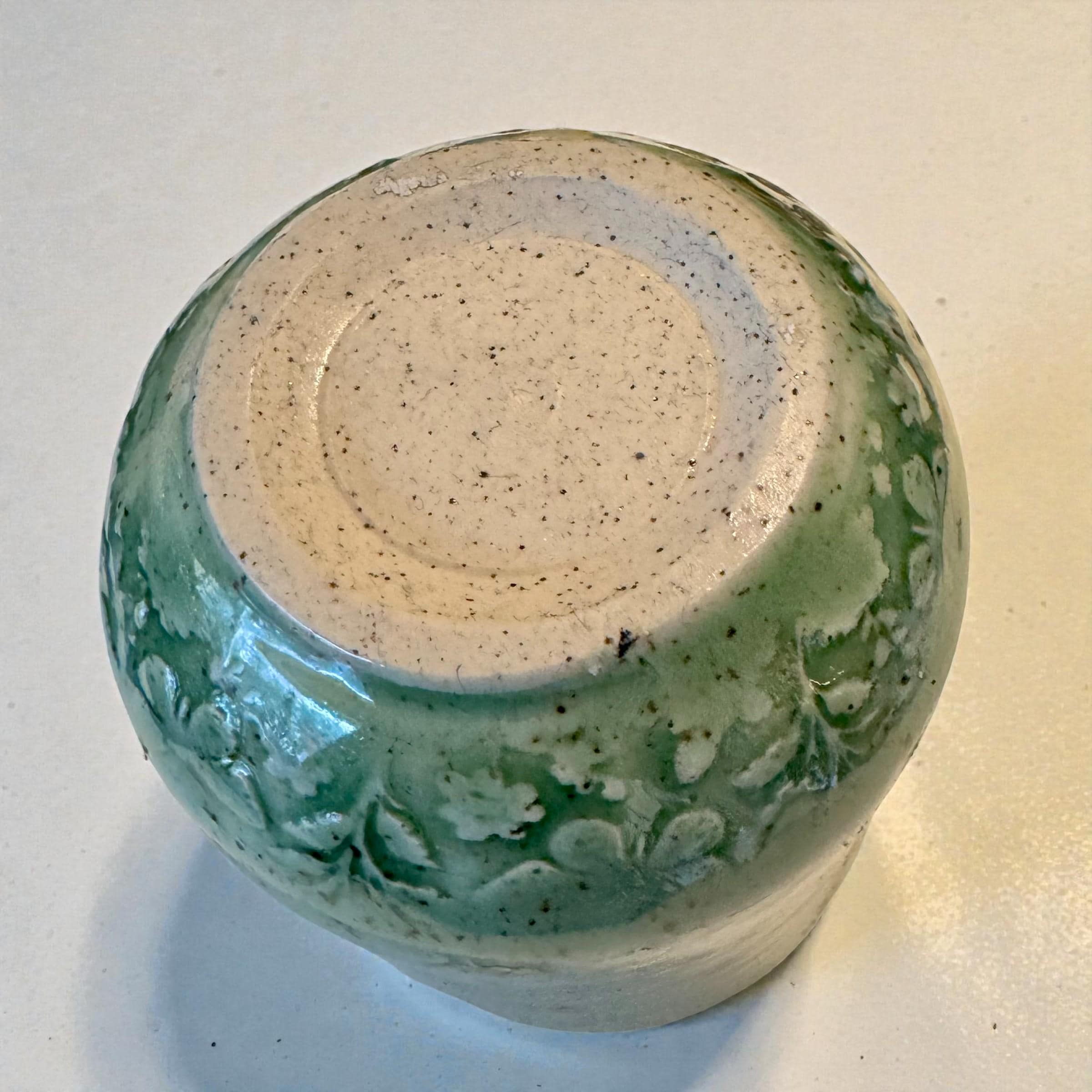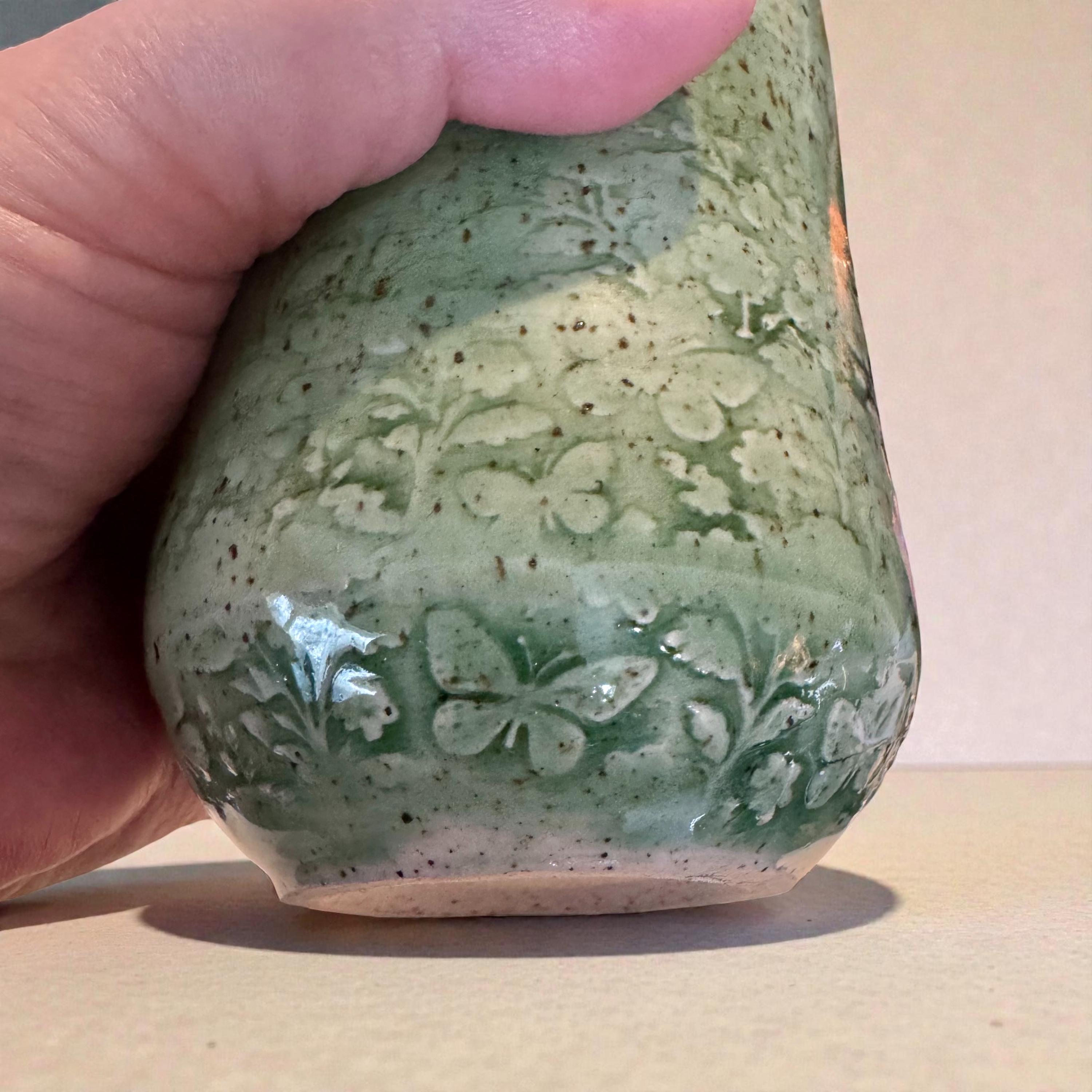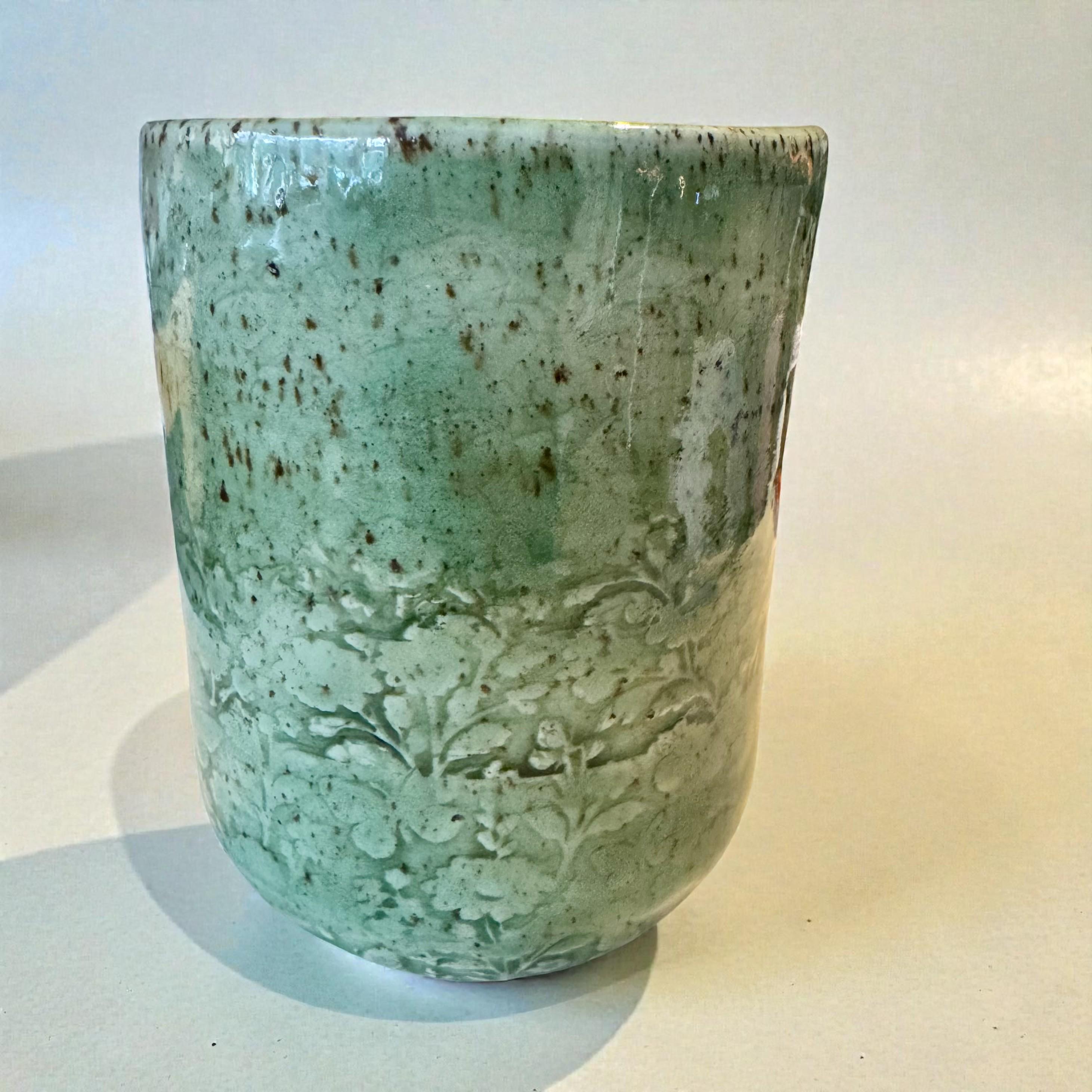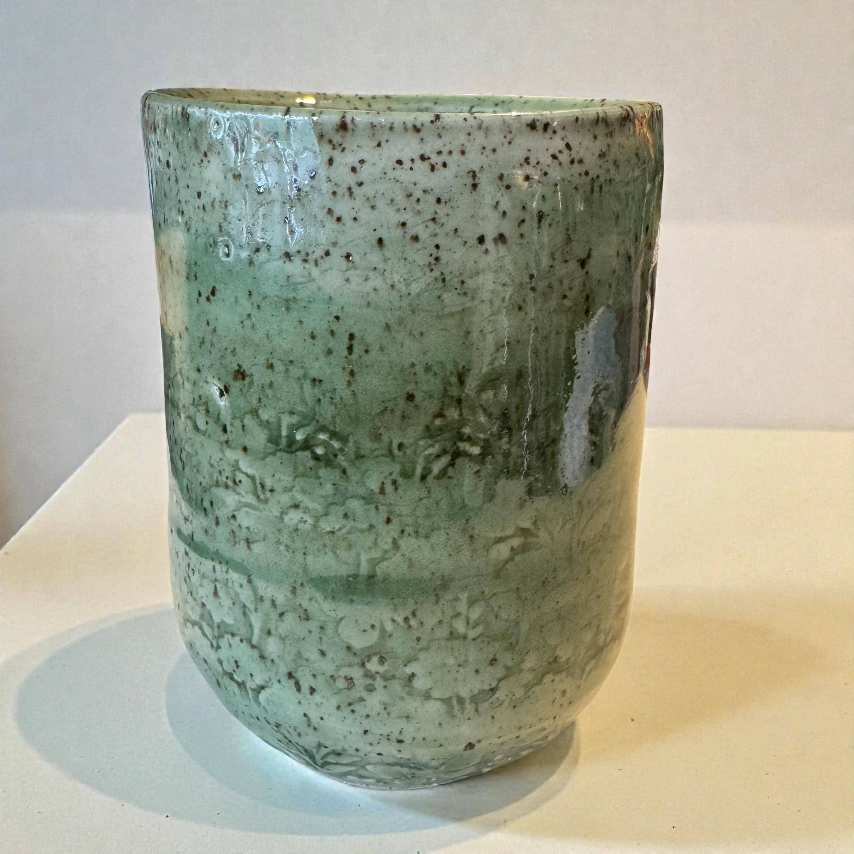 Details * Approx. 8 oz capacity * Measures about 4” tall x 3” wide * Wheel-thrown speckled white stoneware * Glossy green glaze with natural variation * Soft floral relief texture * One of a kind — you will receive the exact piece shown
