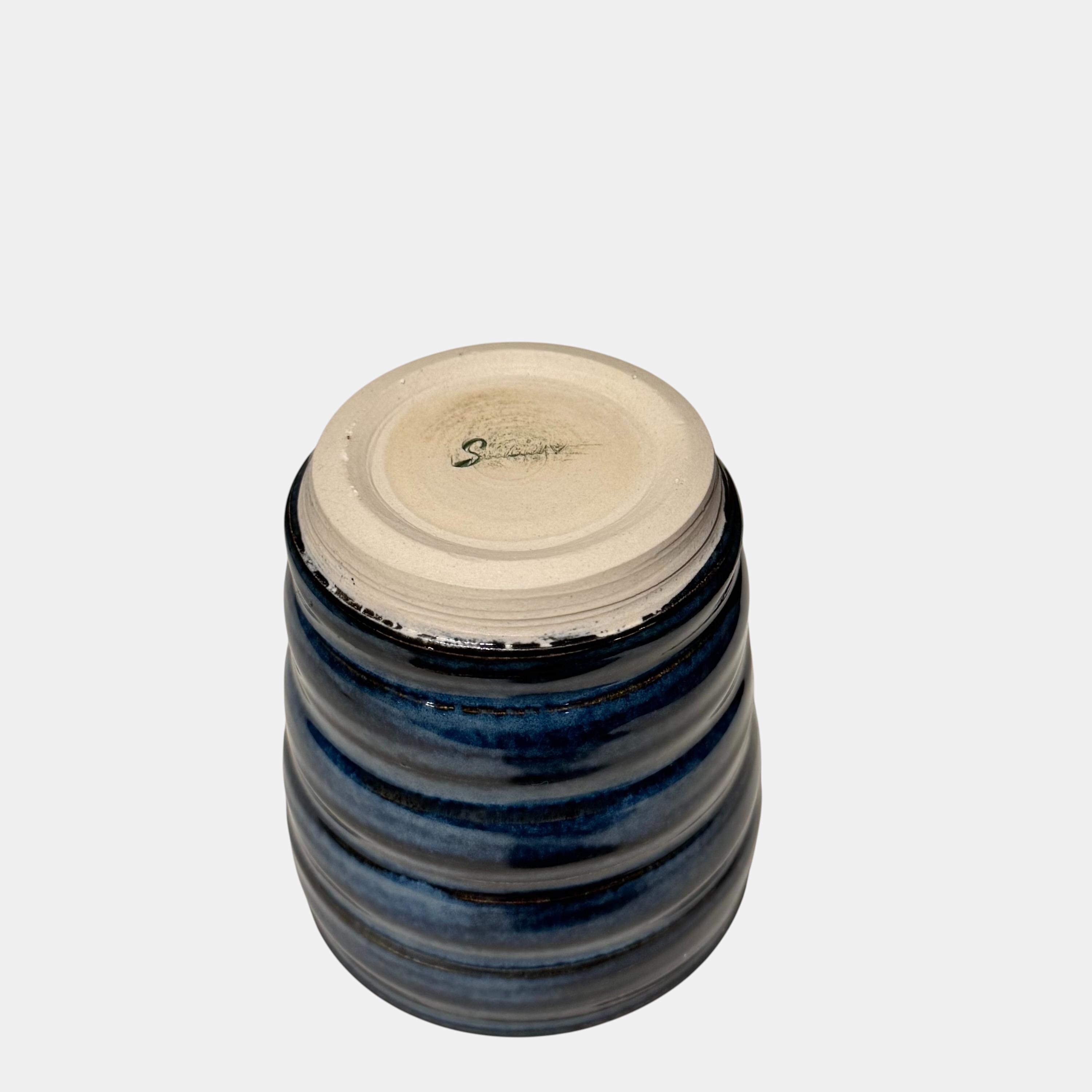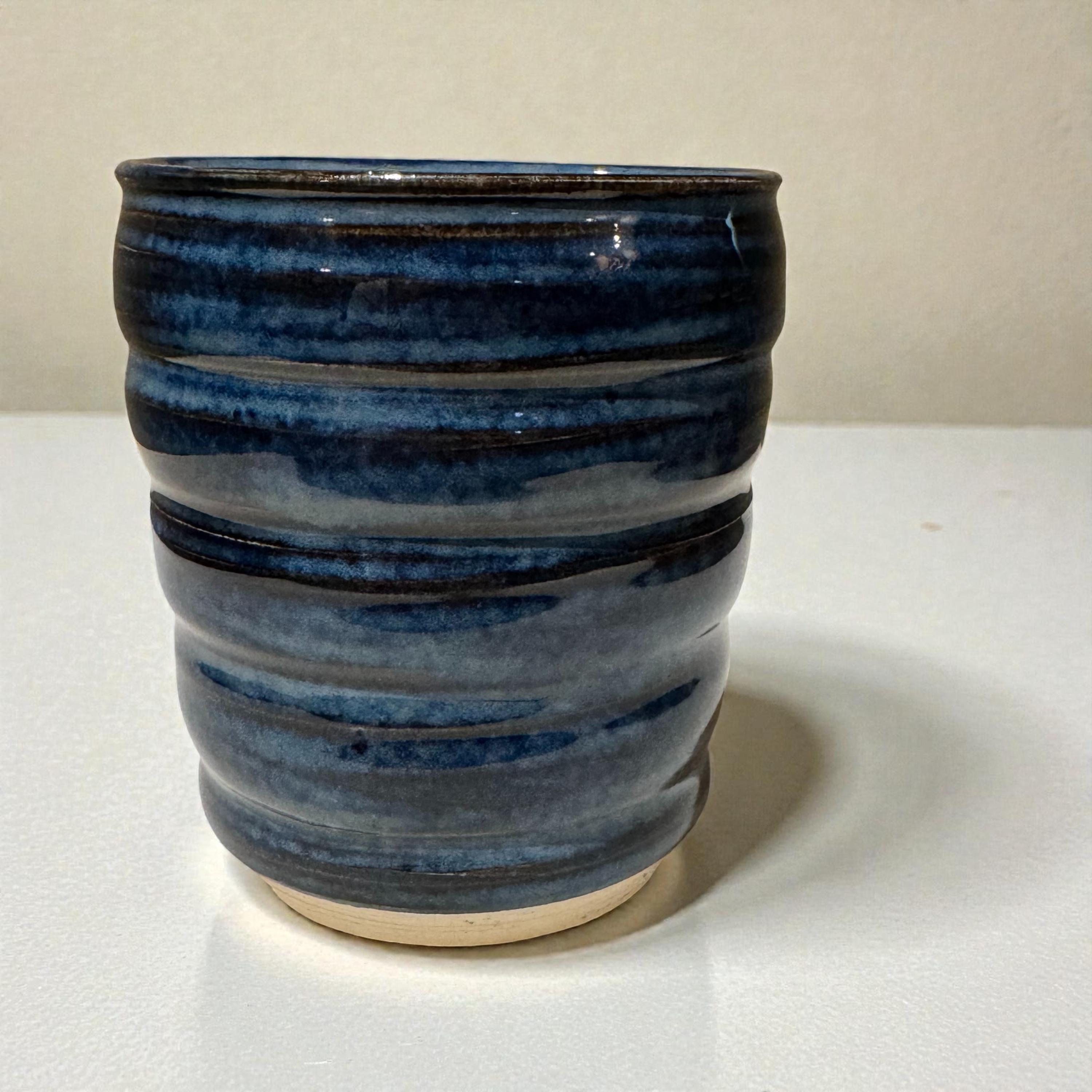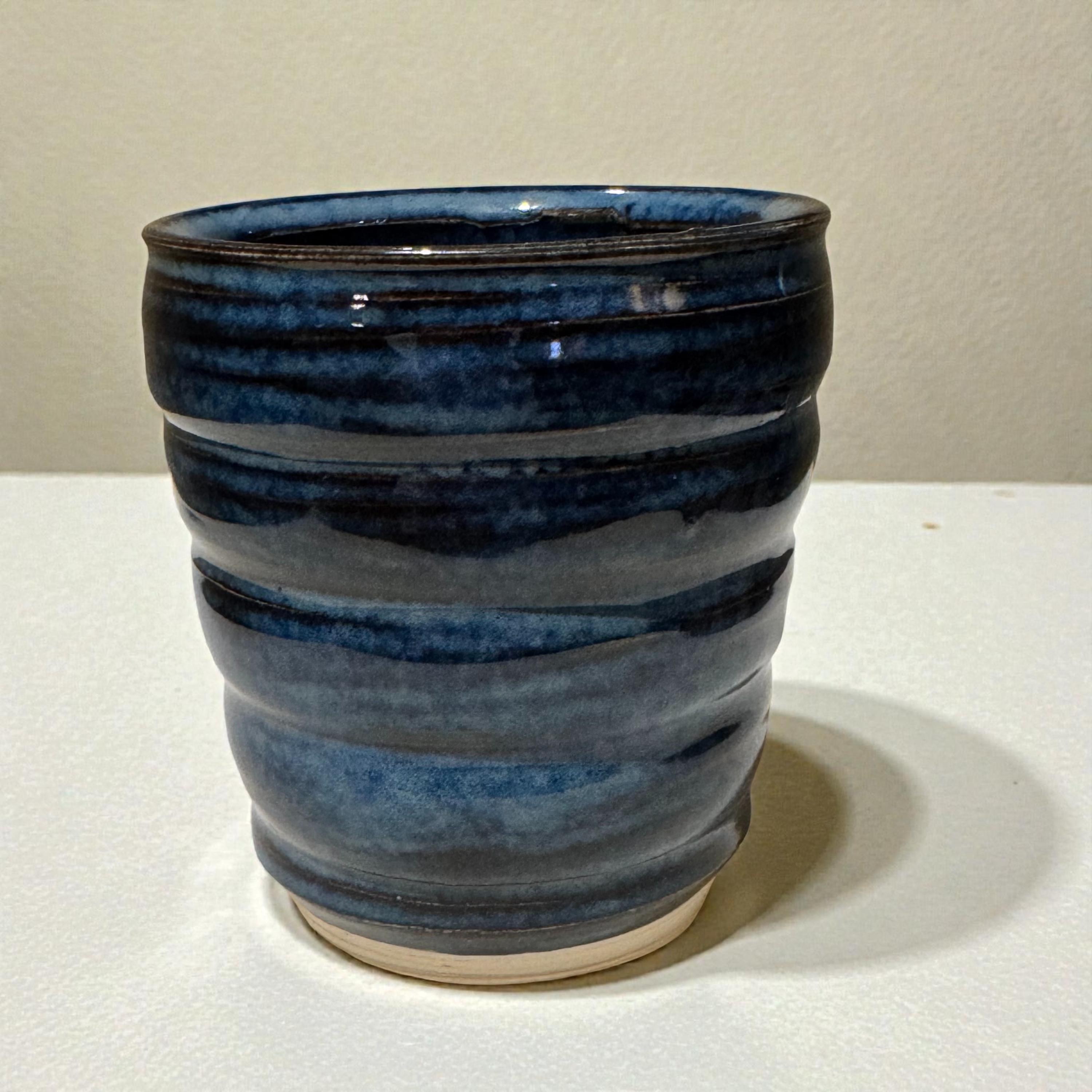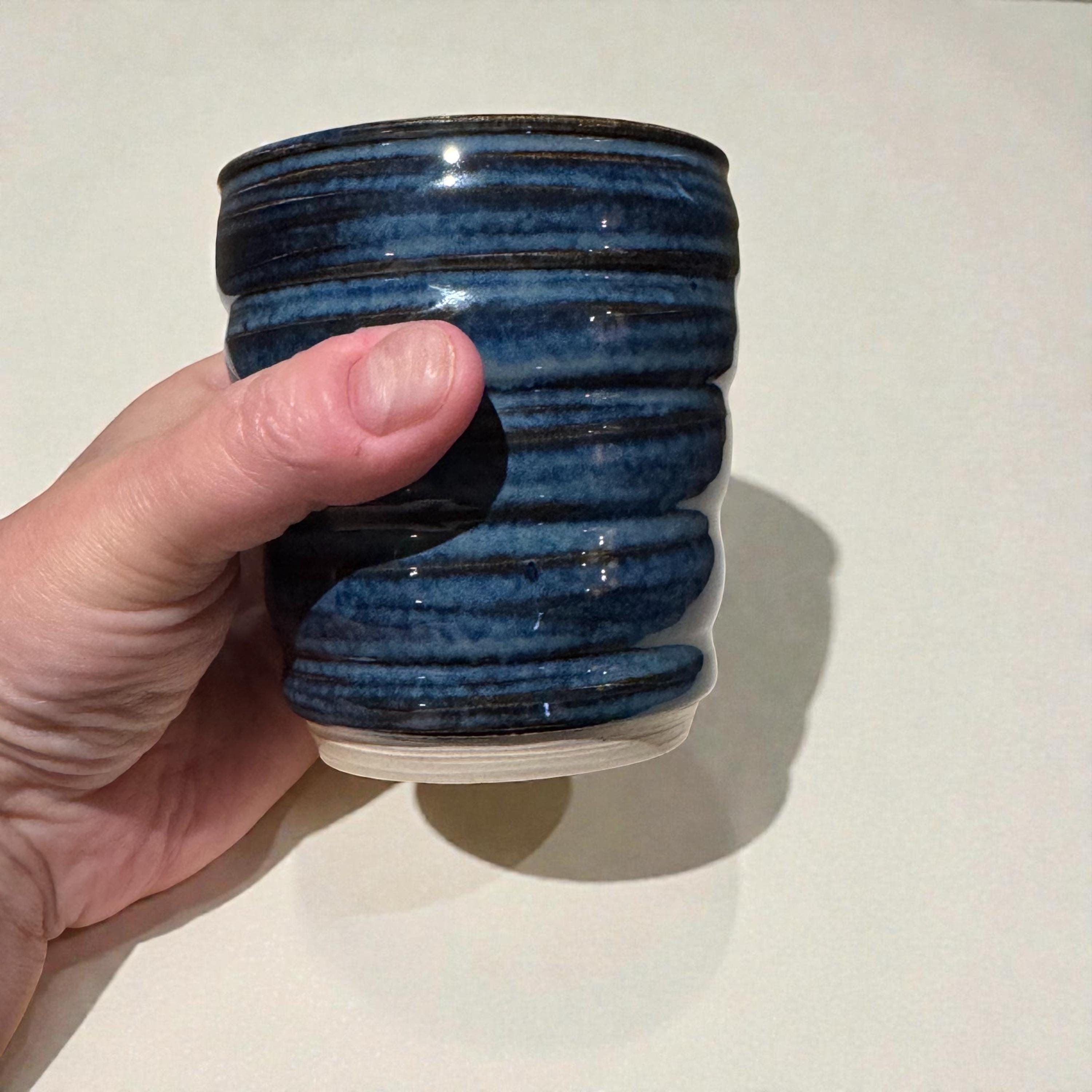 This small, wheel-thrown tumbler features layered blue and charcoal glazes that pool and break over soft horizontal throwing lines, creating depth and quiet movement across the surface. The exterior texture adds a natural grip, while the glossy interior glaze feels smooth and comfortable in use.