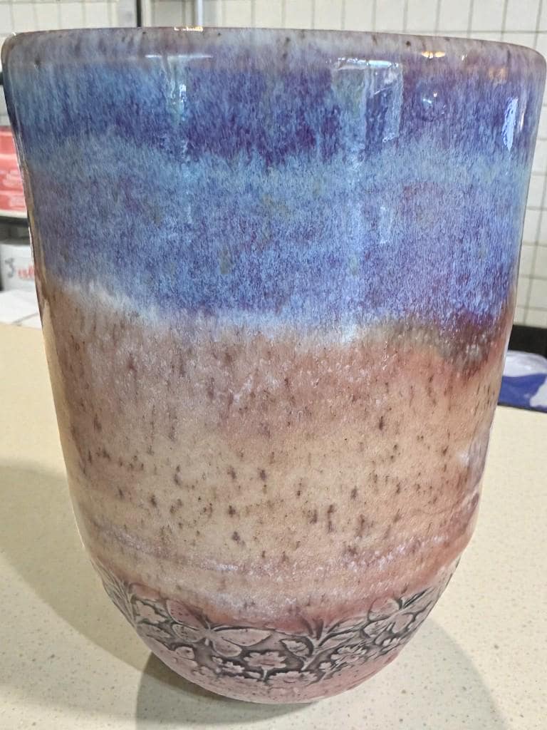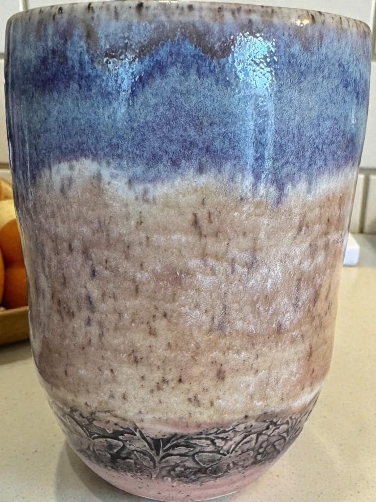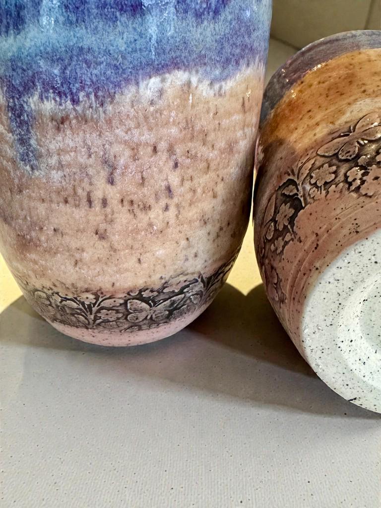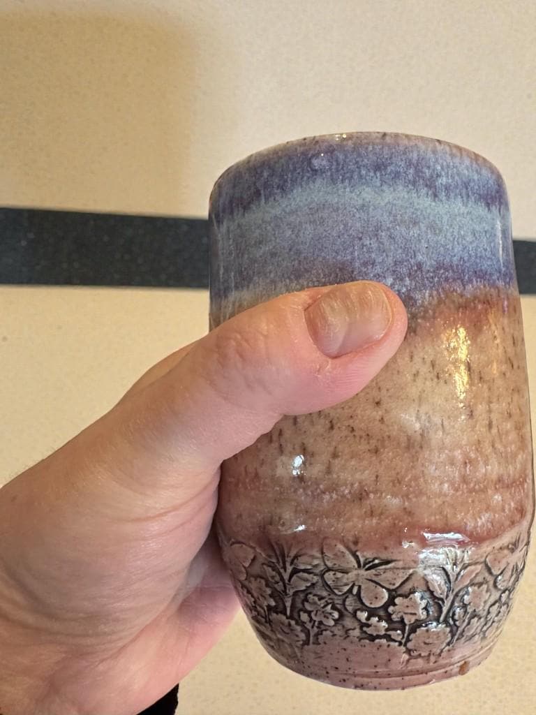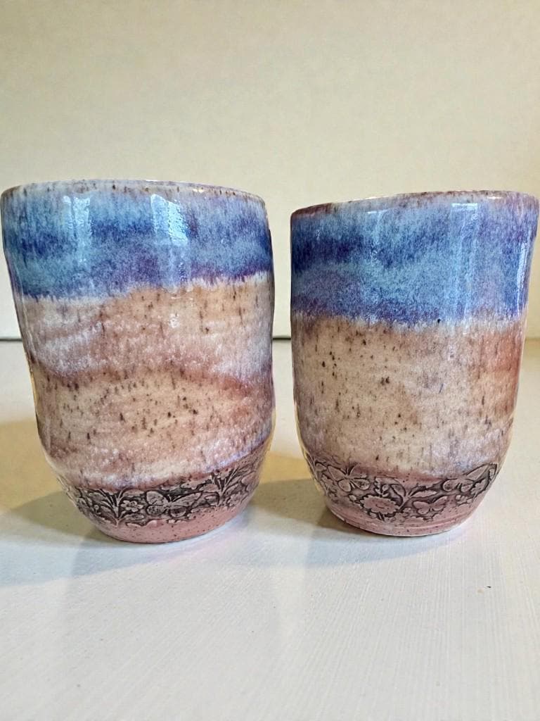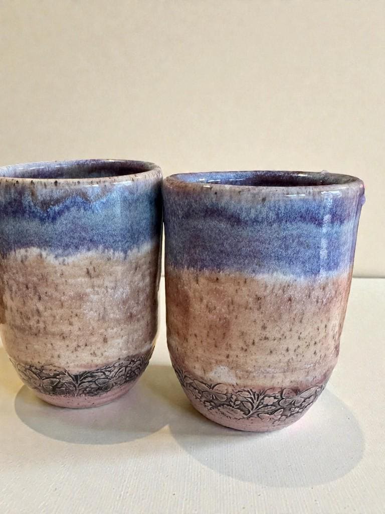 Details: * Set of two ceramic tumblers * Approx. 12 oz capacity each * Glaze colors: soft blue and lavender with earthy undertones * Subtle floral relief pattern near the base * Food safe and fully functional * Dishwasher safe (hand washing recommended for longevity)