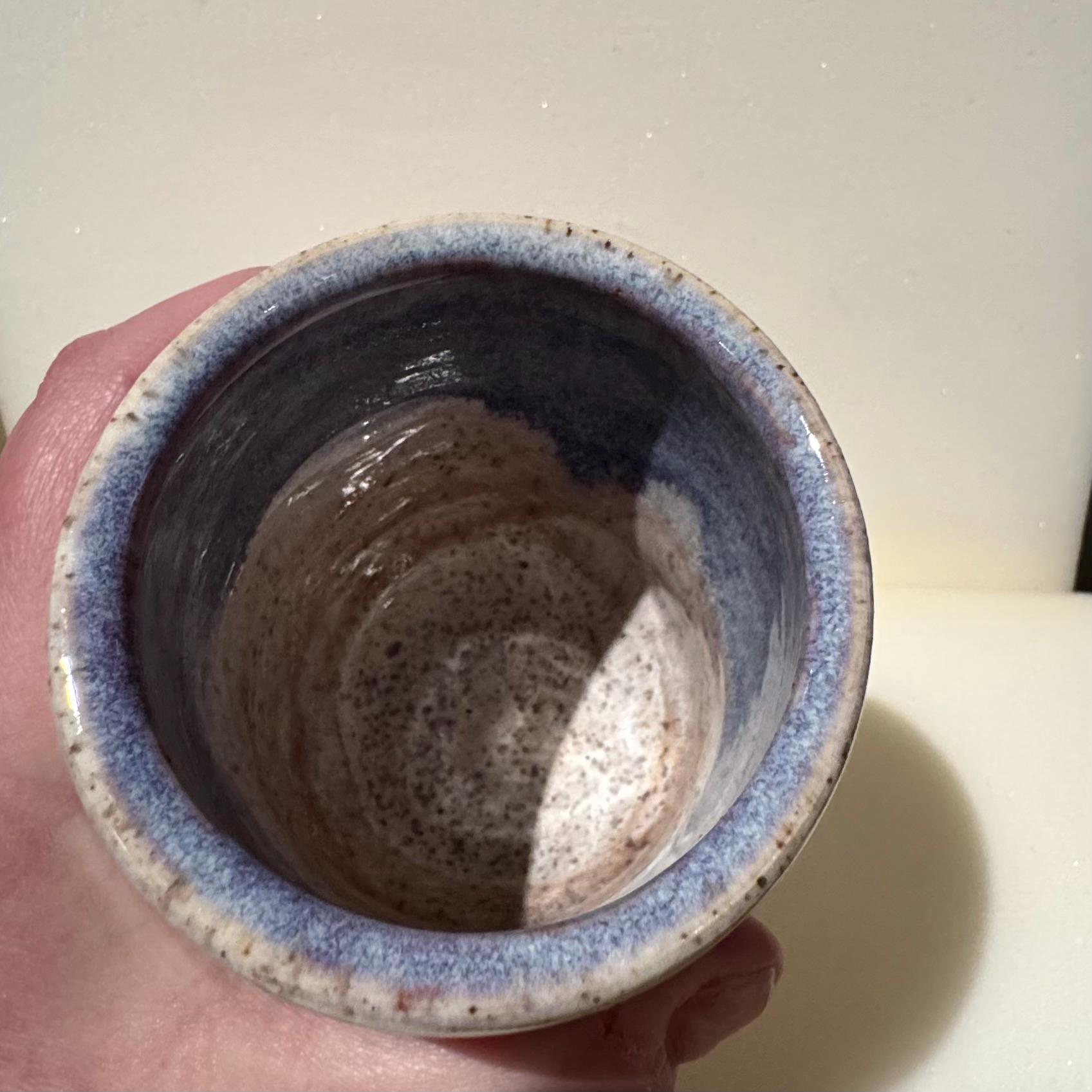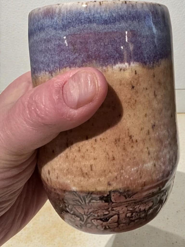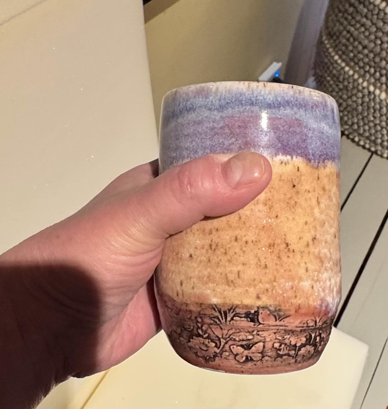 Details: * Approx. 10 oz capacity * Approx 4" tall and 3" wide * Glaze colors: soft blue and lavender with earthy undertones * Subtle floral relief pattern near the base * Food safe and fully functional * Dishwasher safe (hand washing recommended for longevity)