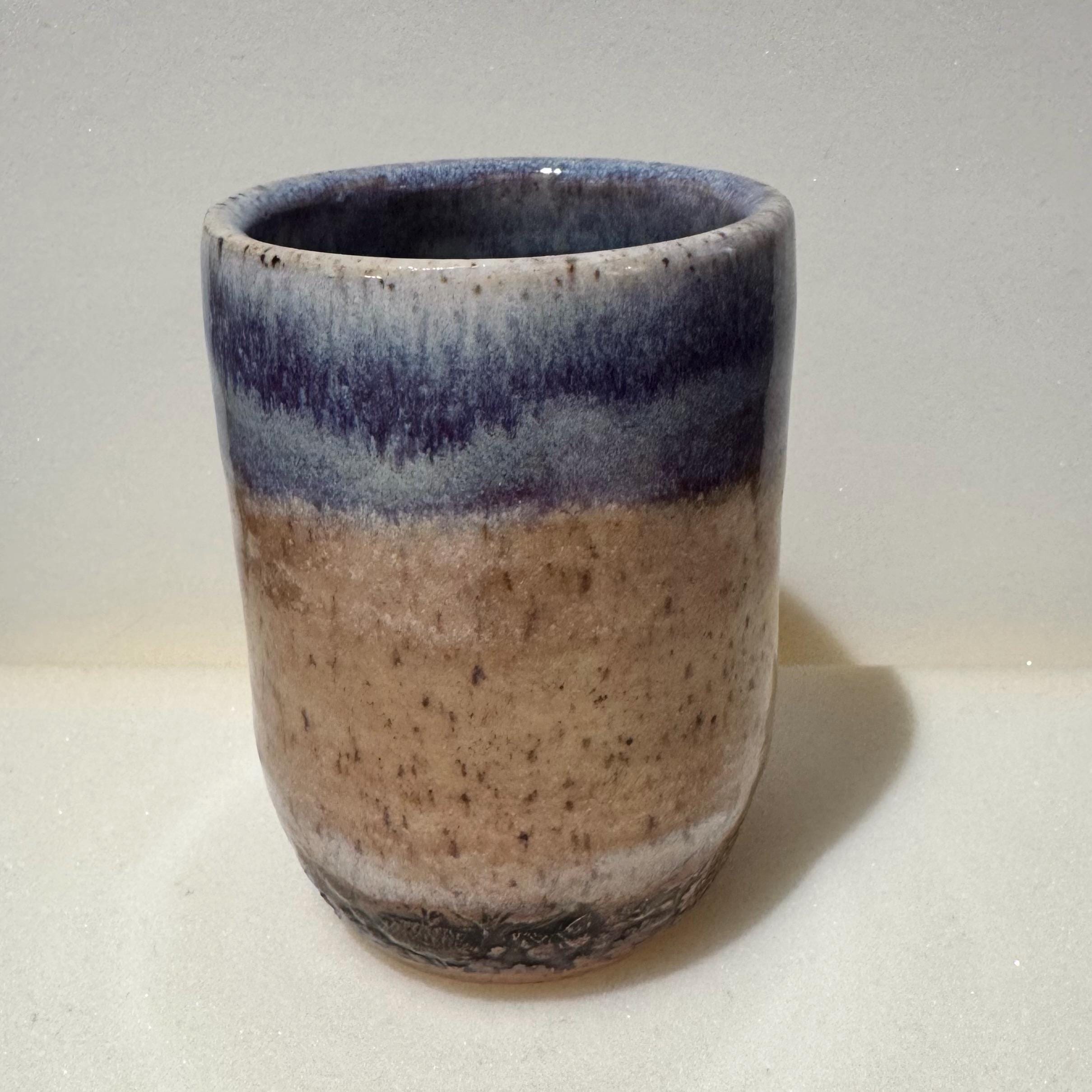 This listing is for a handmade ceramic tumbler, glazed in soft layers of blue and lavender over a warm, earthy clay body. Each cup features a delicate floral relief band near the base that adds quiet texture without overwhelming the form.