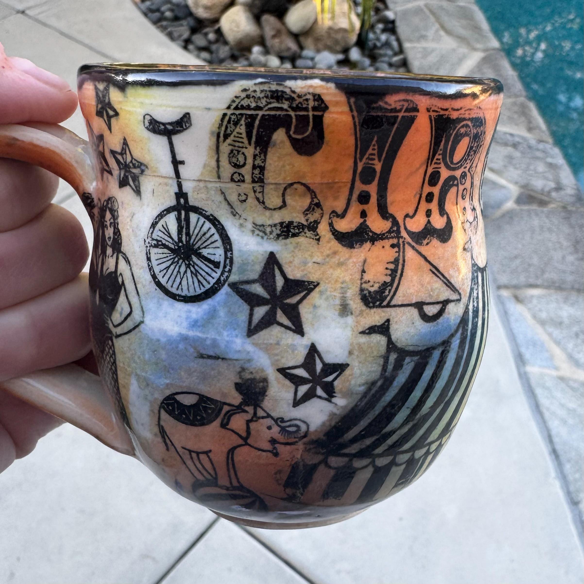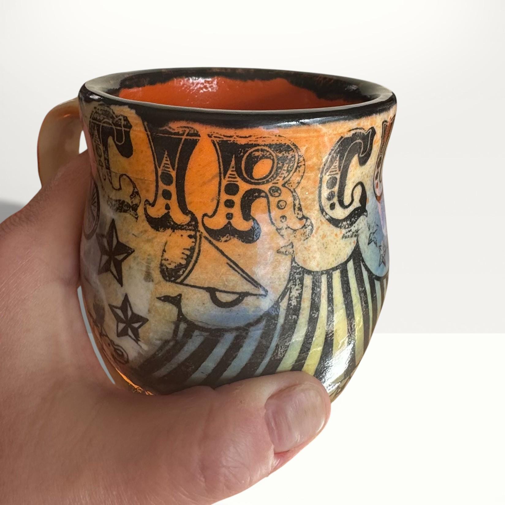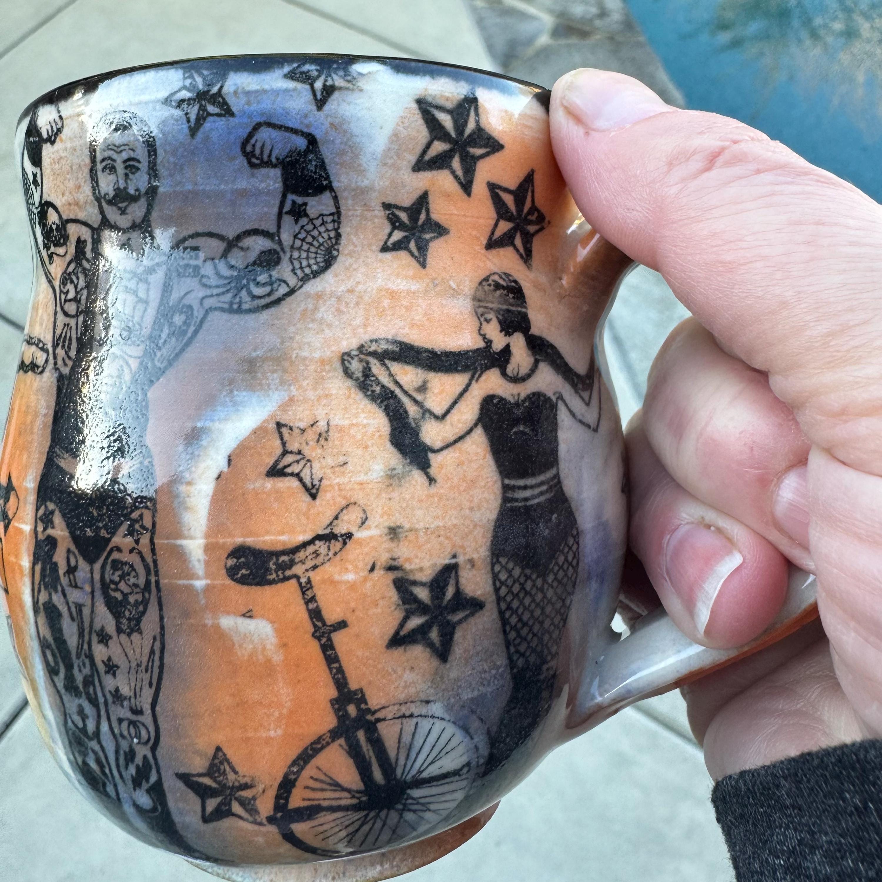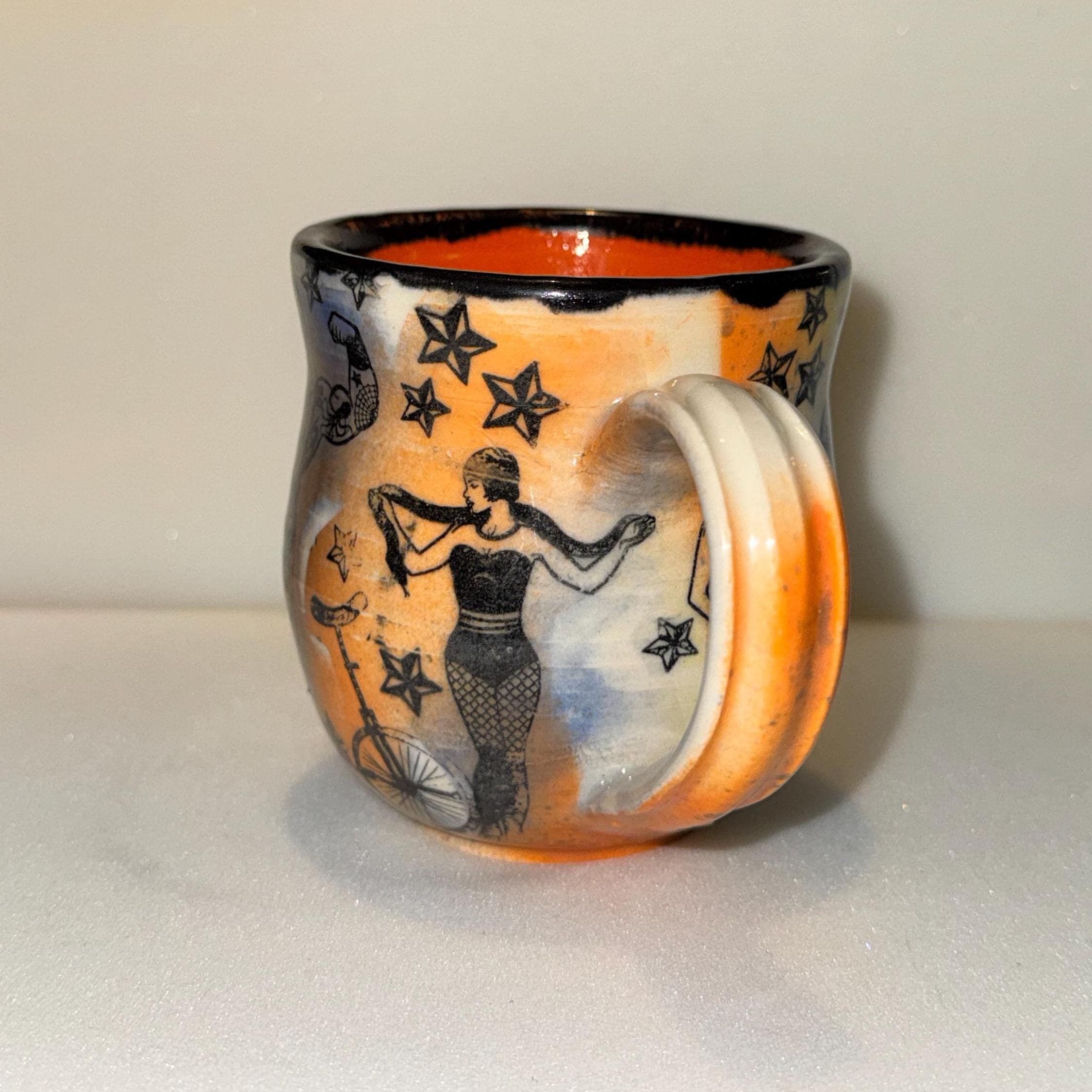 Step right up! This handmade 12 oz ceramic mug brings bold vintage circus energy to your morning ritual. Inspired by old carnival posters, tattoo flash, and traveling sideshows, this piece layers striking black imagery over a smoky wash of orange, cream, and soft blue tones.