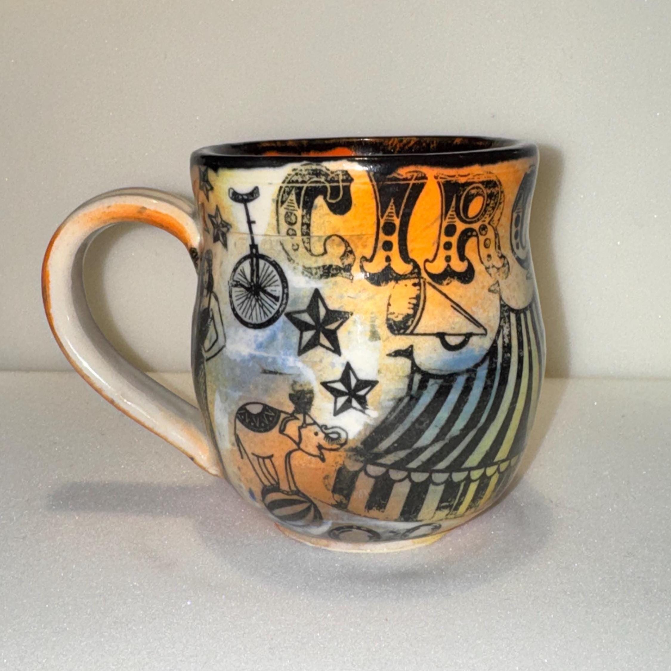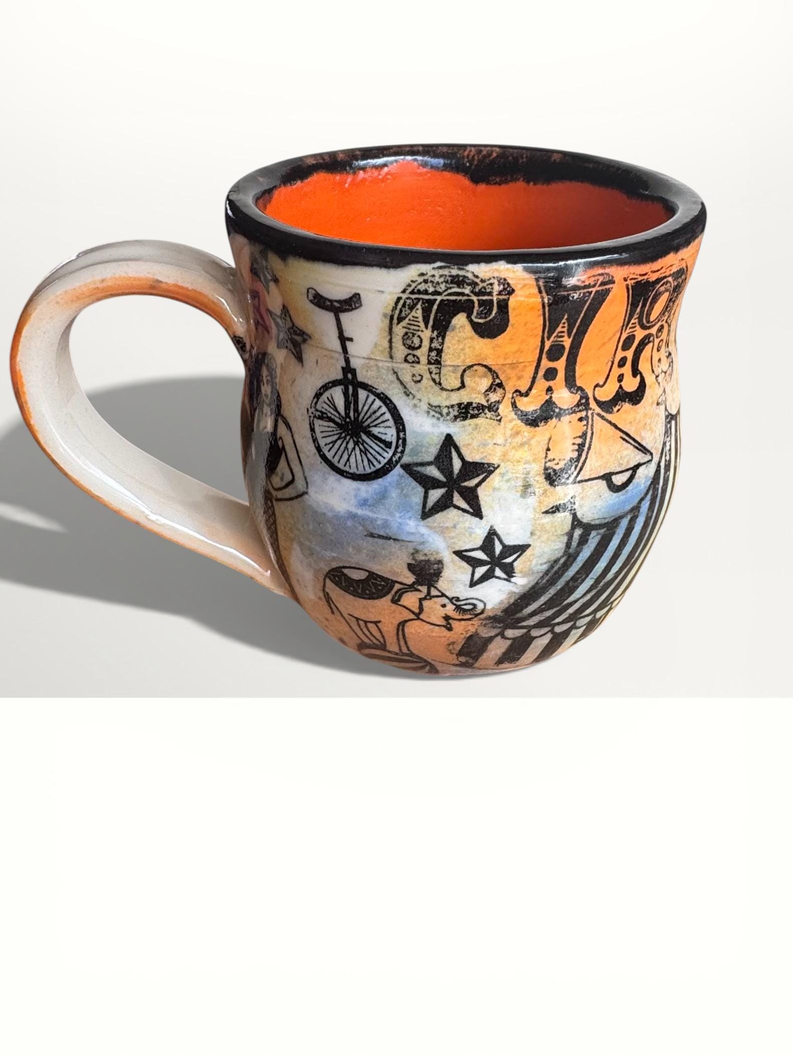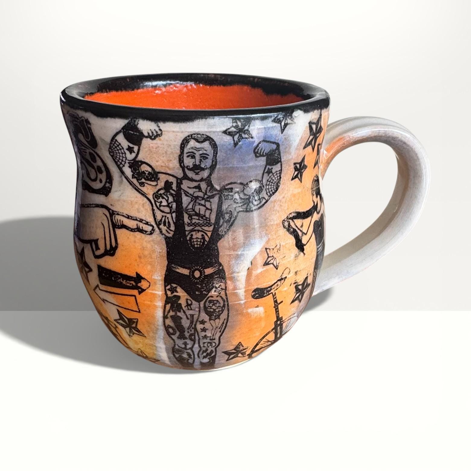 Step right up! This handmade 12 oz ceramic mug brings bold vintage circus energy to your morning ritual. Inspired by old carnival posters, tattoo flash, and traveling sideshows, this piece layers striking black imagery over a smoky wash of orange, cream, and soft blue tones.