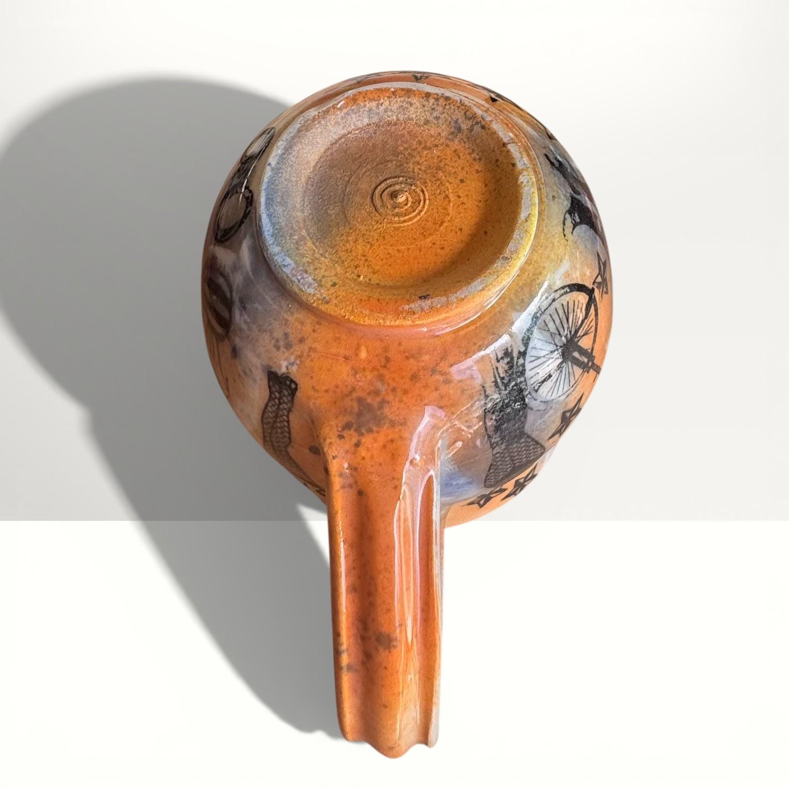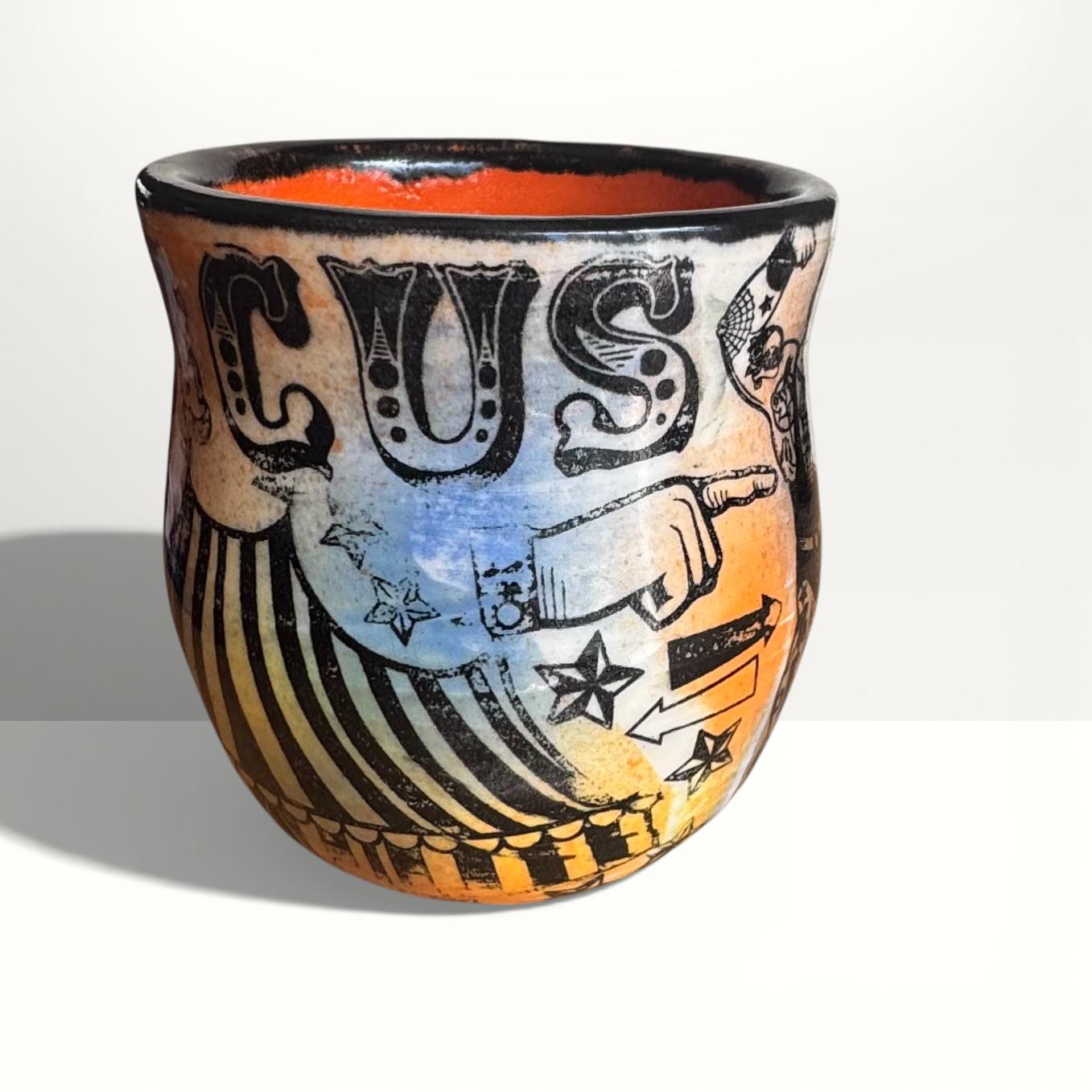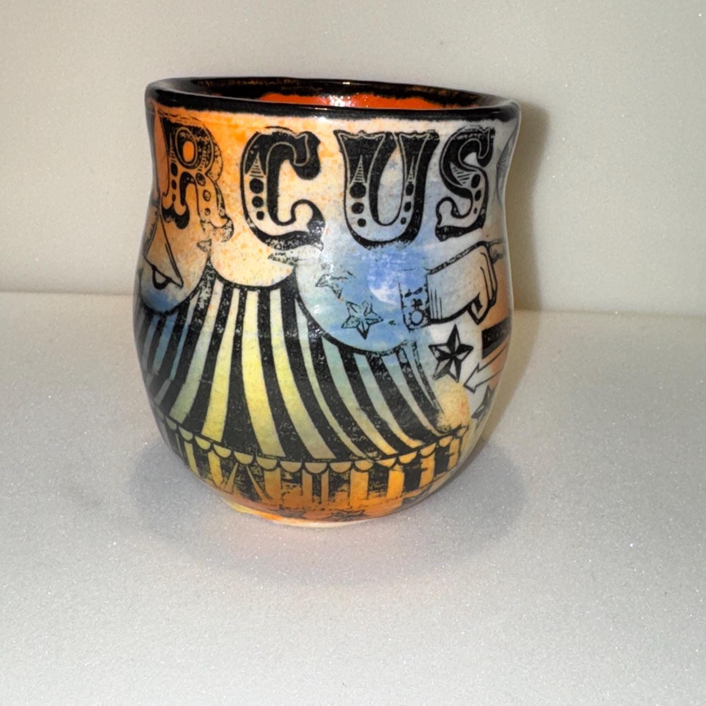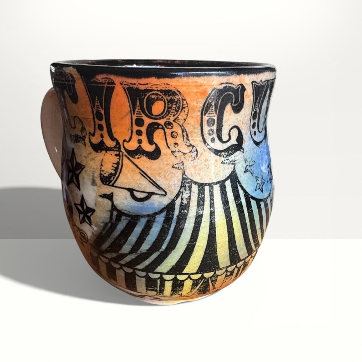 Step right up! This handmade 12 oz ceramic mug brings bold vintage circus energy to your morning ritual. Inspired by old carnival posters, tattoo flash, and traveling sideshows, this piece layers striking black imagery over a smoky wash of orange, cream, and soft blue tones.