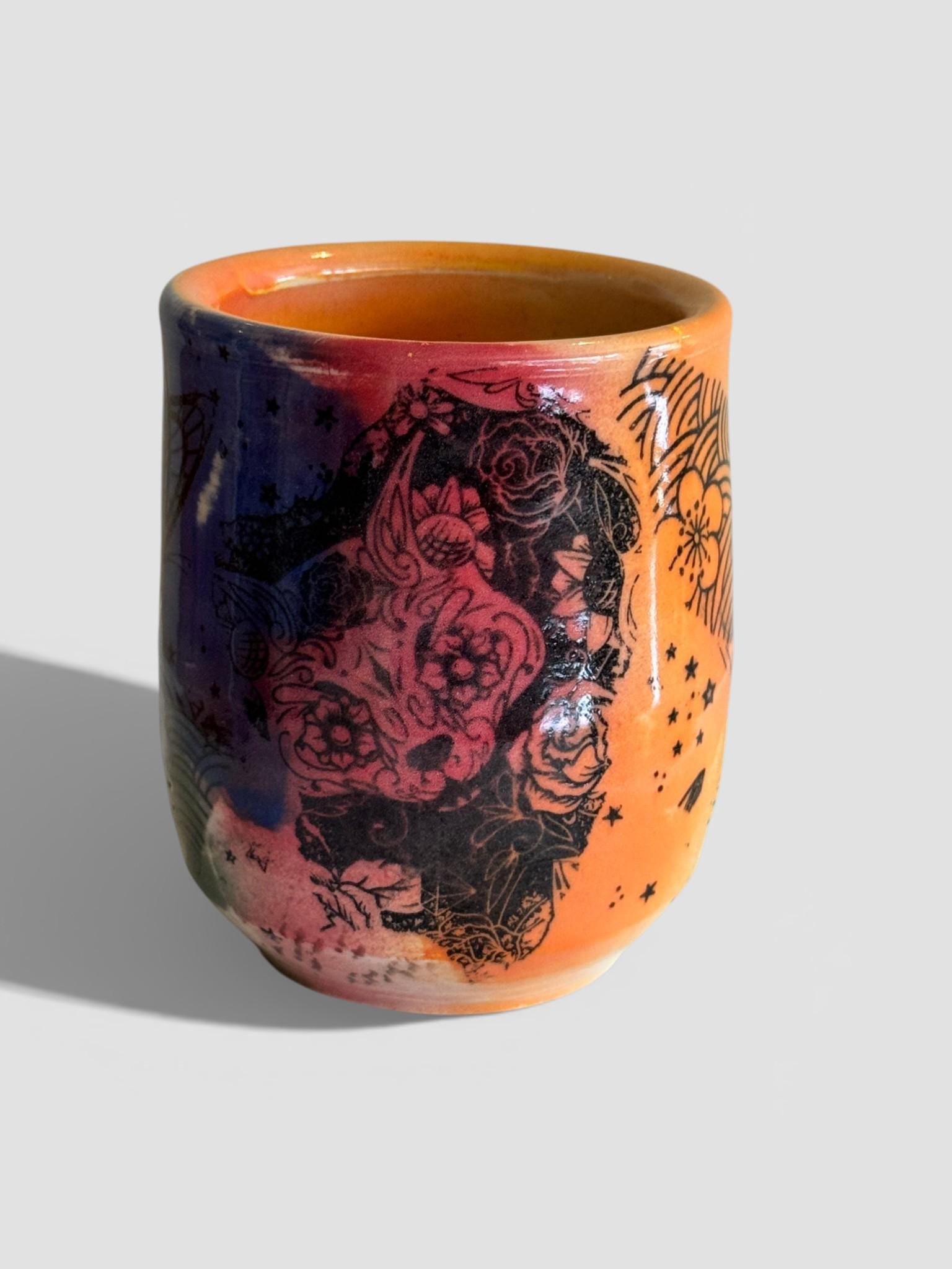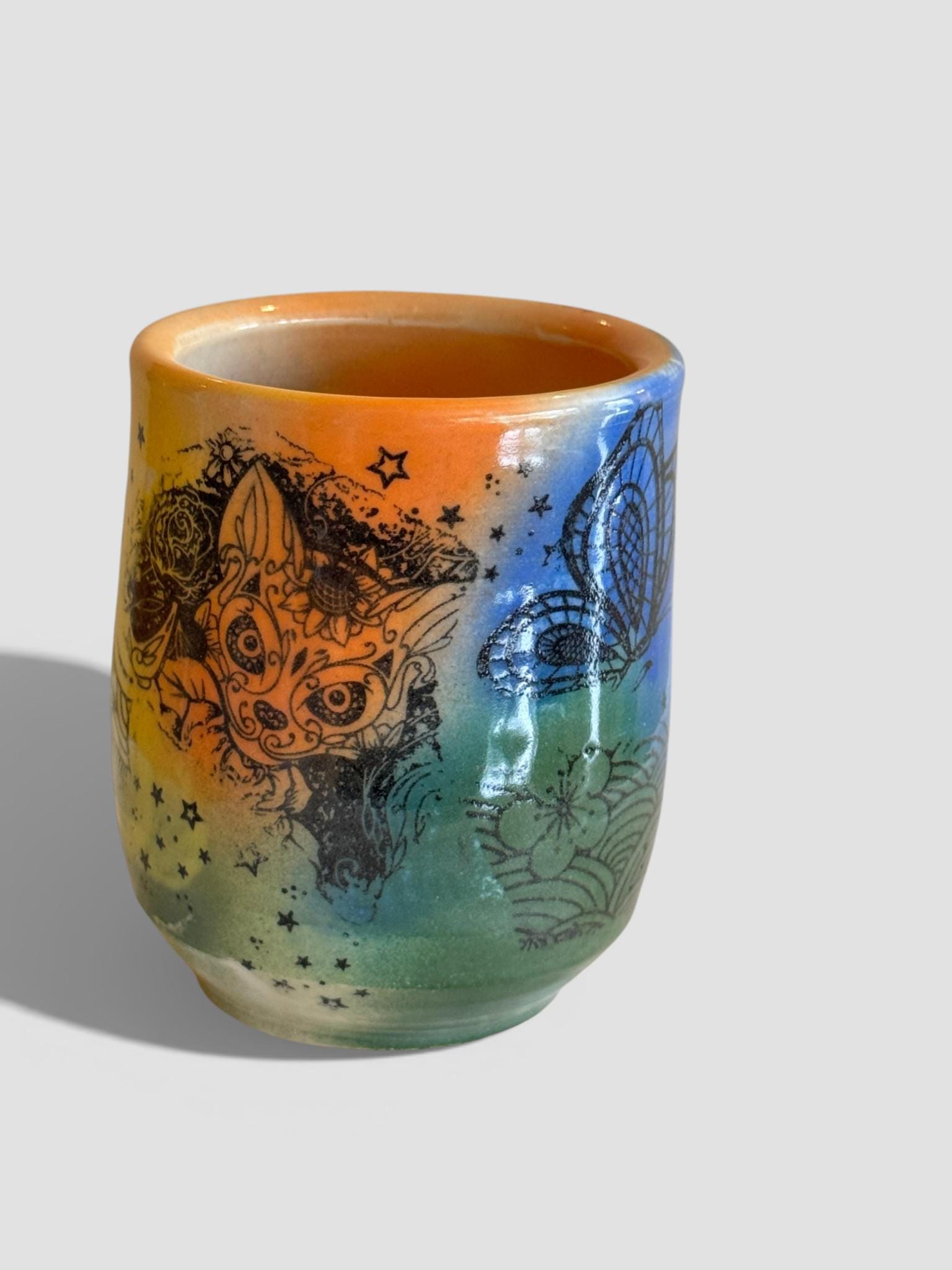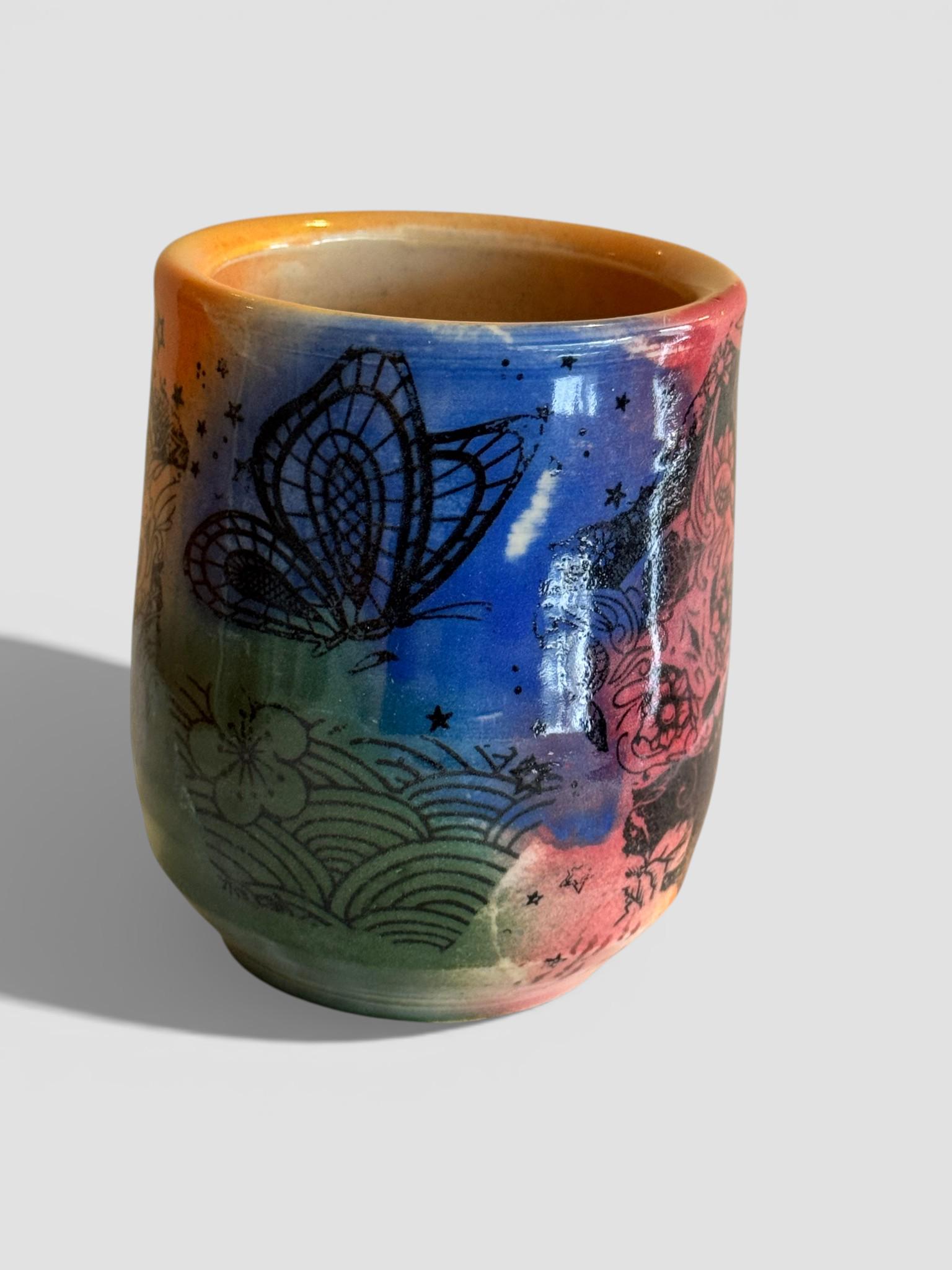 This handmade ceramic tumbler is crafted from white stoneware and finished with a vibrant layered glaze that blends warm orange, coral, blue, and green tones. Each piece is decorated with bold black graphic imagery including butterflies, florals, and a stylized sugar skull motif, creating a striking pop-art inspired design.