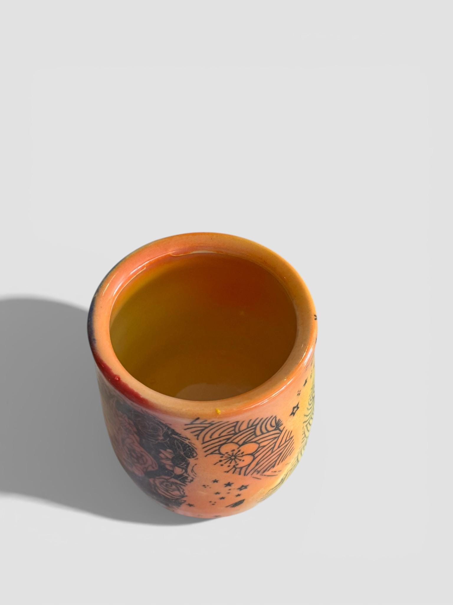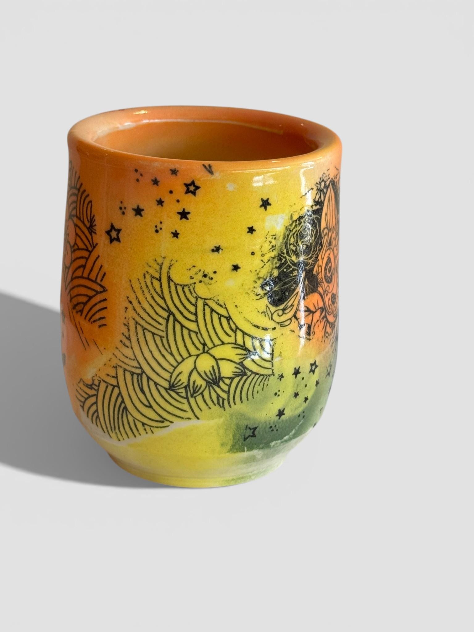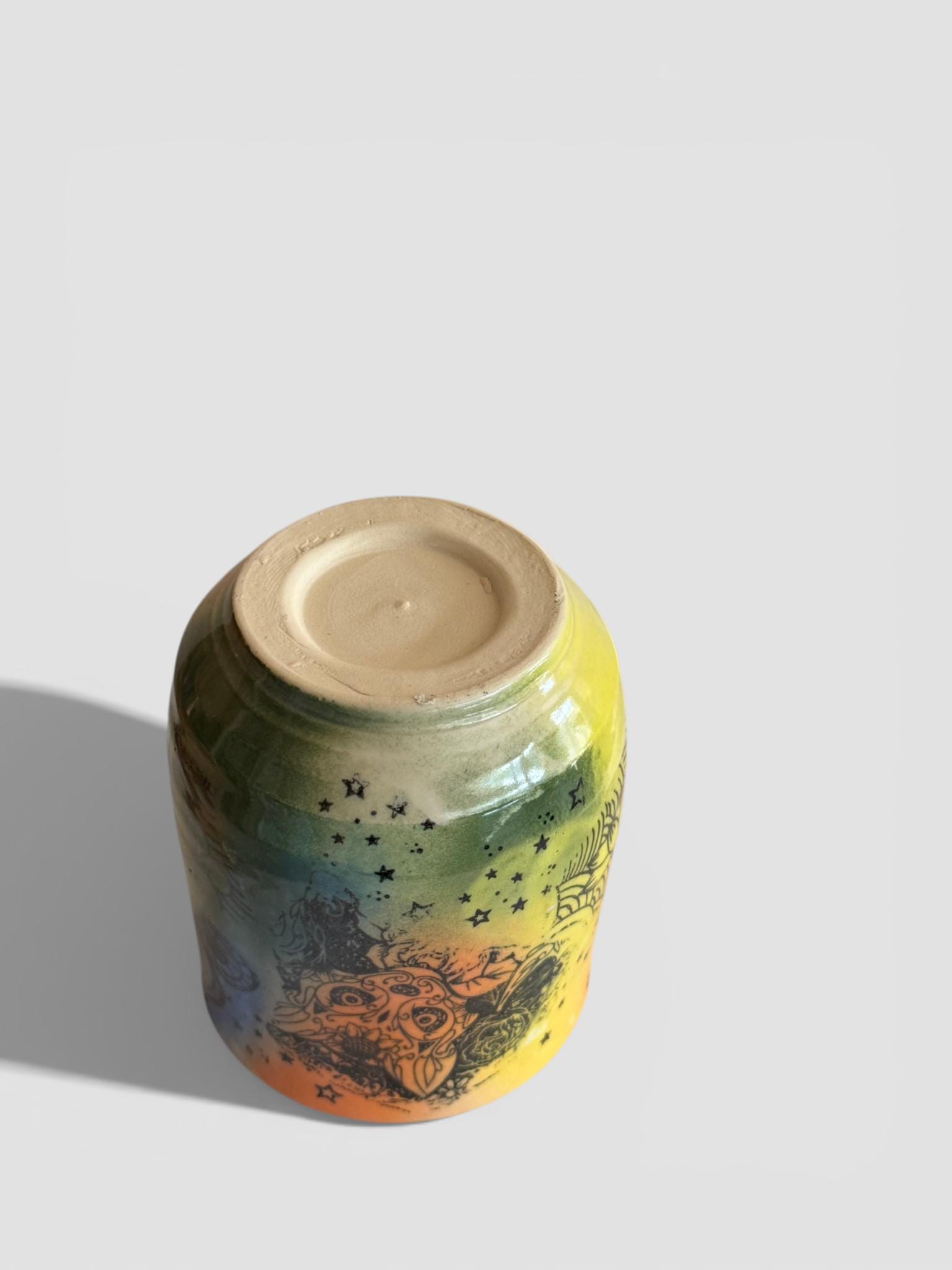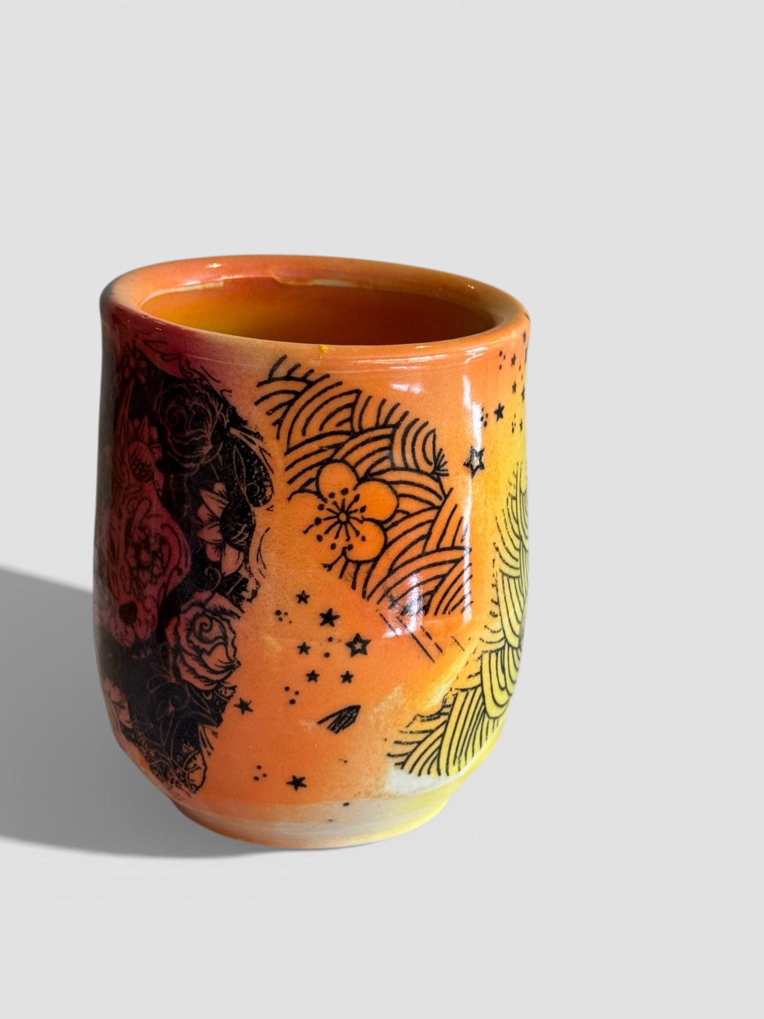 This handmade ceramic tumbler is crafted from white stoneware and finished with a vibrant layered glaze that blends warm orange, coral, blue, and green tones. Each piece is decorated with bold black graphic imagery including butterflies, florals, and a stylized sugar skull motif, creating a striking pop-art inspired design.