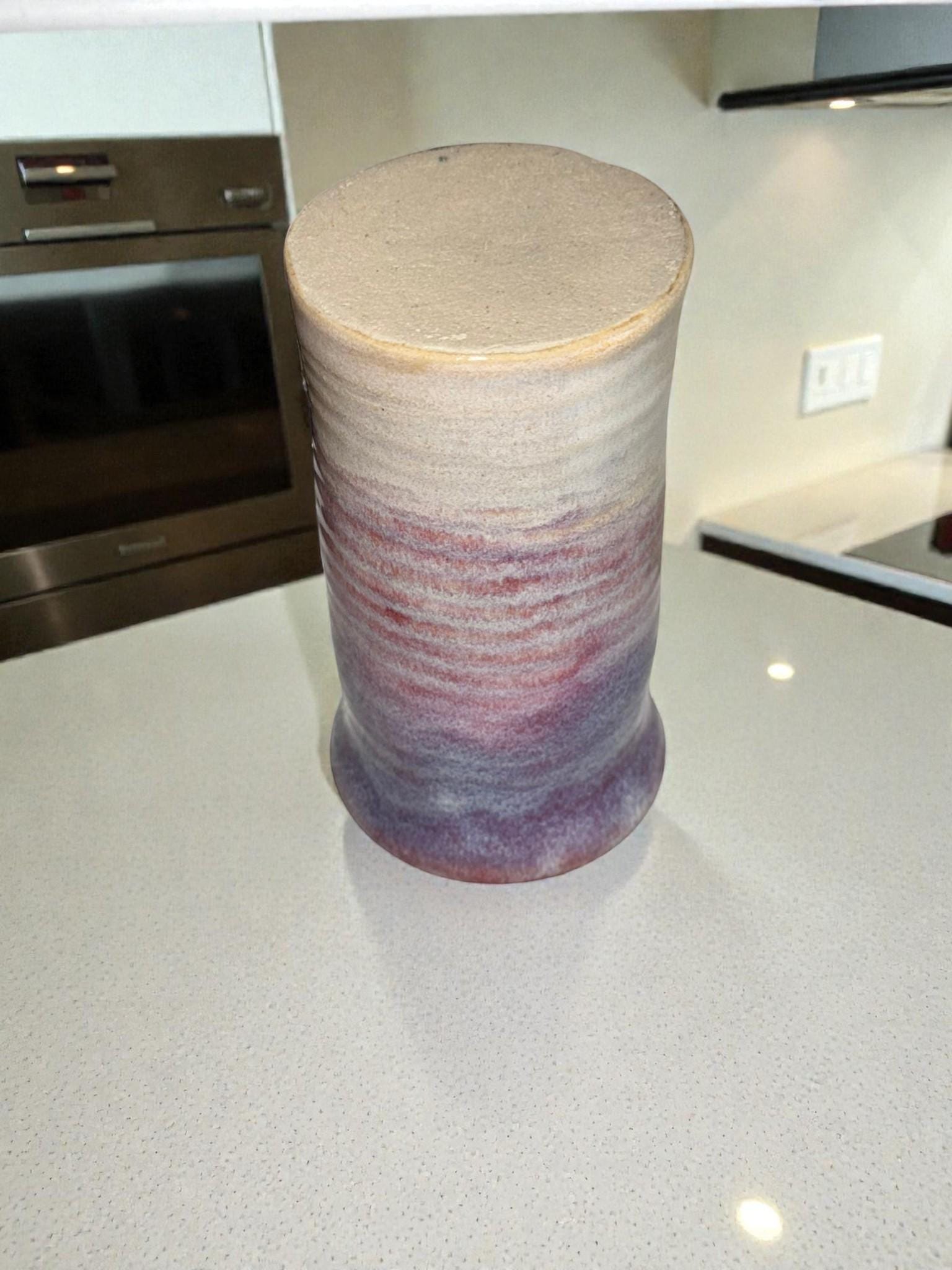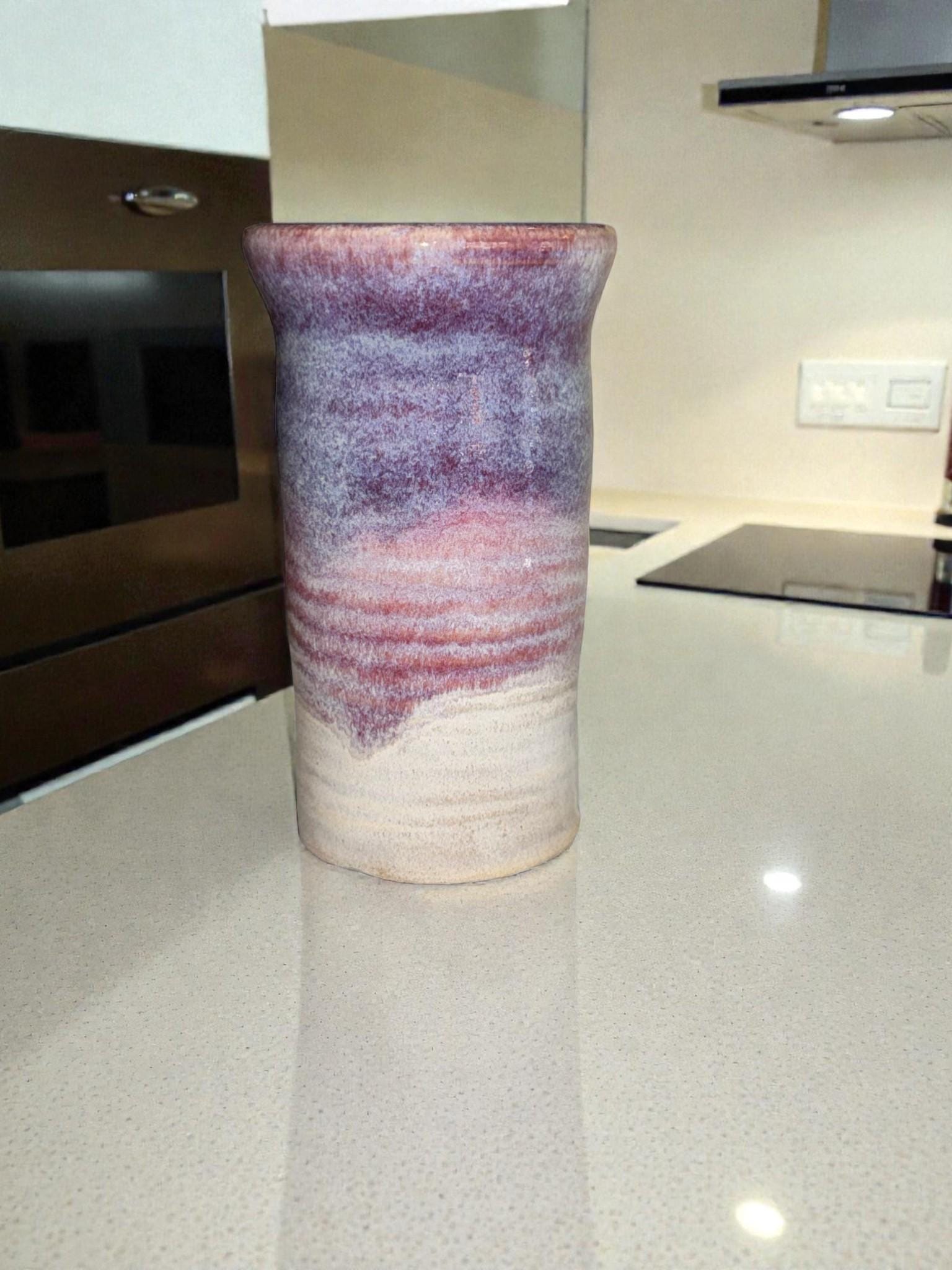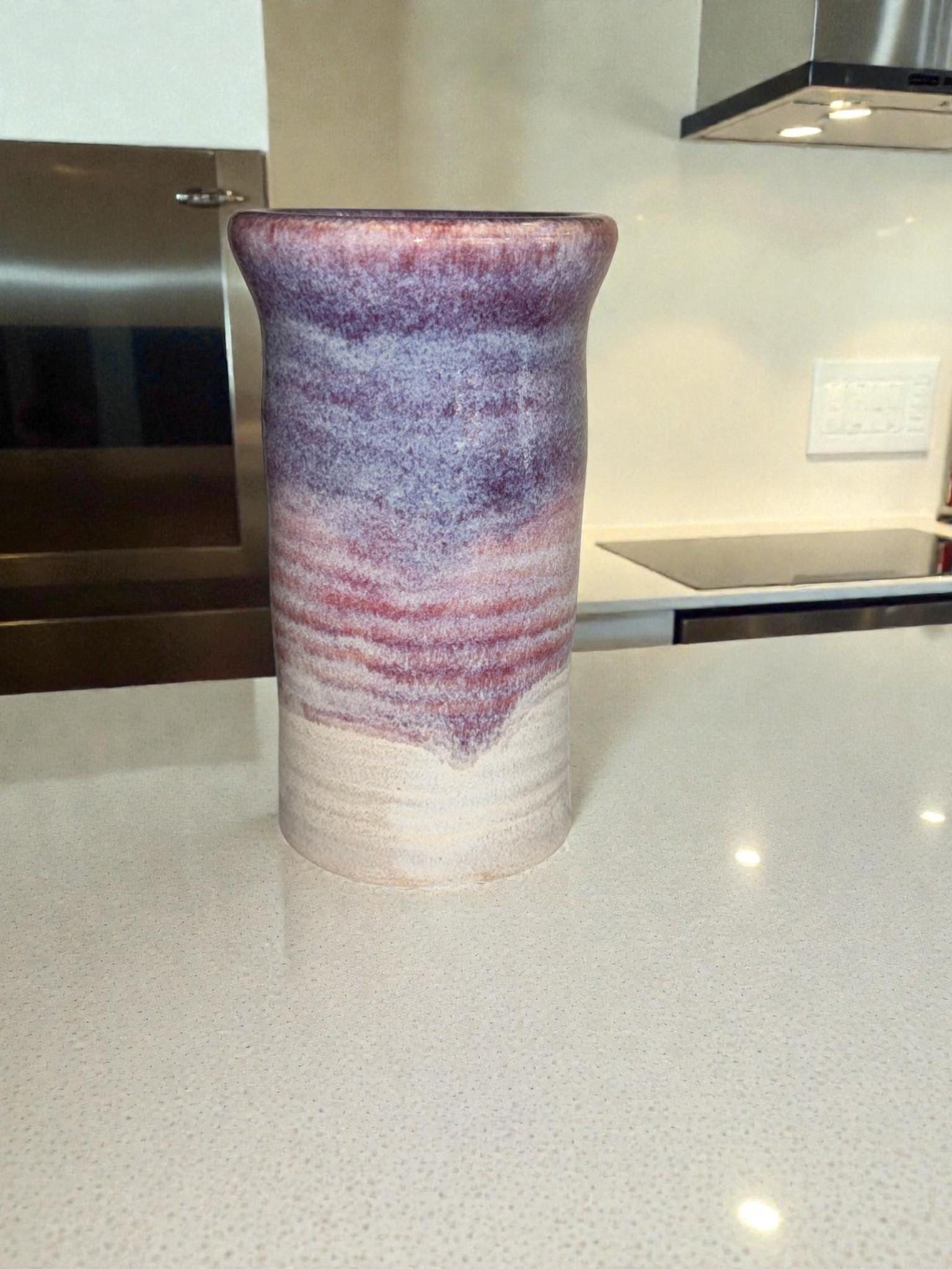 This handmade ceramic vase is wheel thrown from durable stoneware and finished with a soft layered glaze in shades of purple, blush, and natural clay tones. The subtle color transitions create a calm, organic look that works beautifully in both modern and rustic spaces.