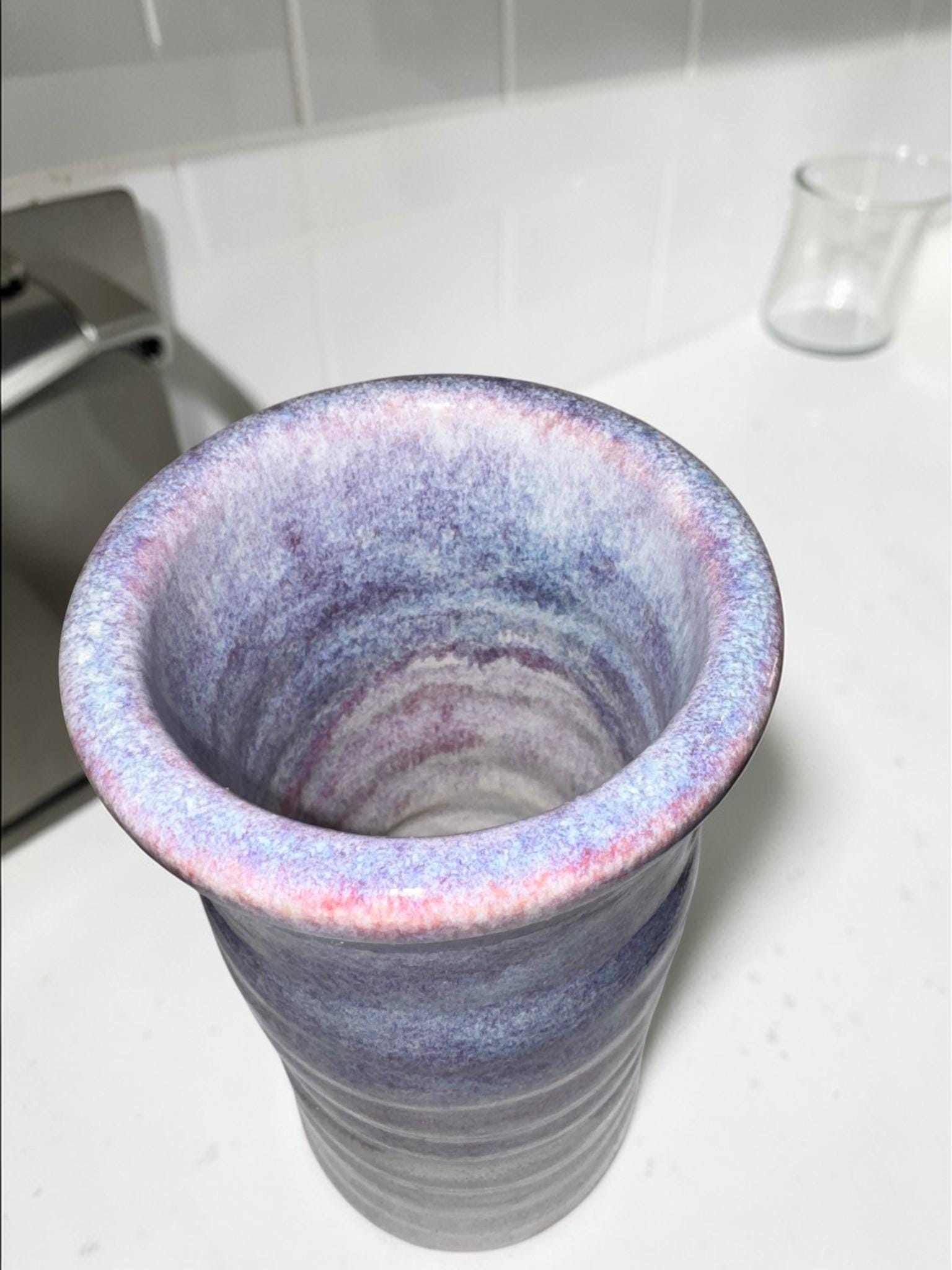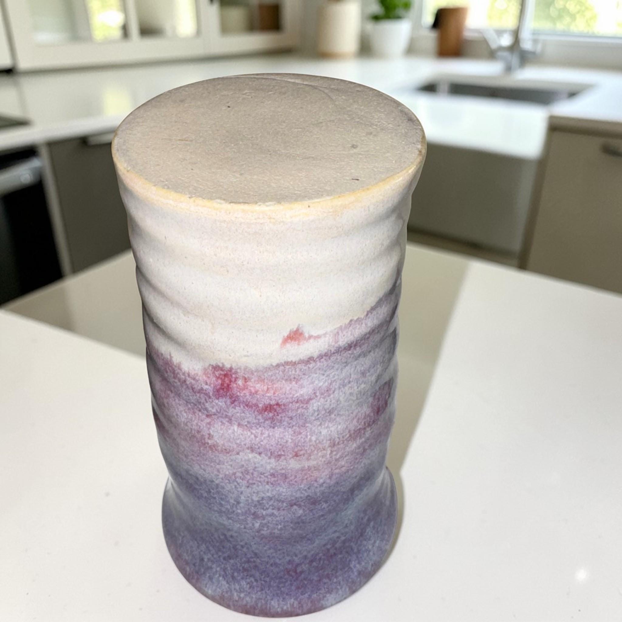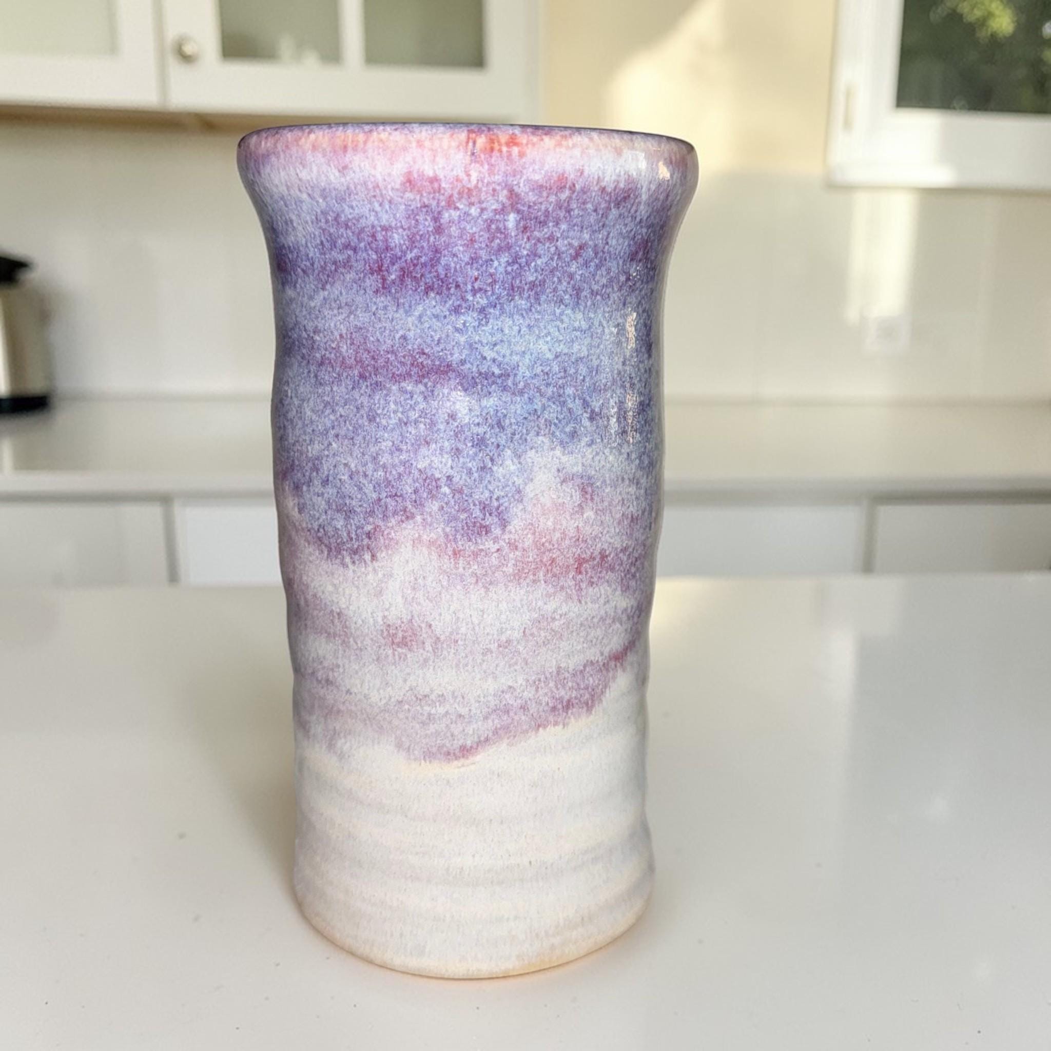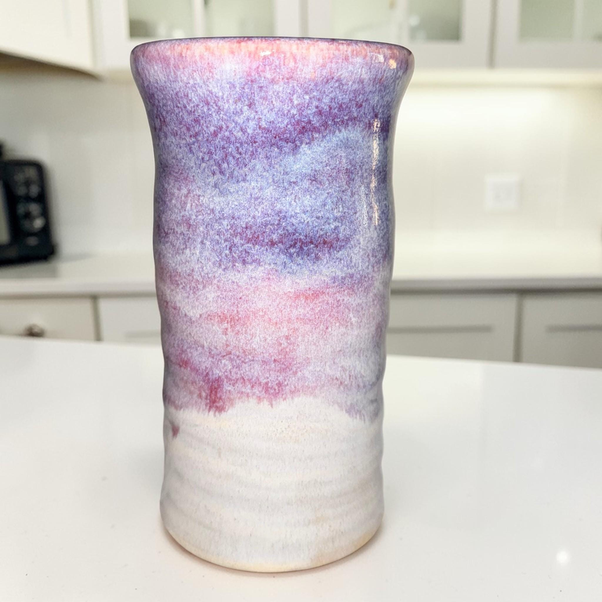 Details: • Height: approximately 6.5 inches • Material: stoneware clay • Finish: layered purple and blush glaze with soft honey white base • Wheel thrown and kiln fired for durability • Food-safe glaze (though designed primarily for decorative floral use)