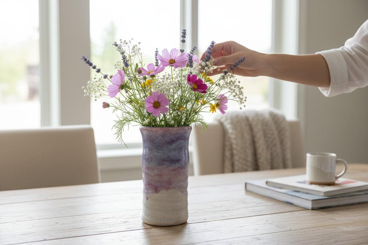 This handmade ceramic vase is wheel thrown from durable stoneware and finished with a soft layered glaze in shades of purple, blush, and natural clay tones. The subtle color transitions create a calm, organic look that works beautifully in both modern and rustic spaces.