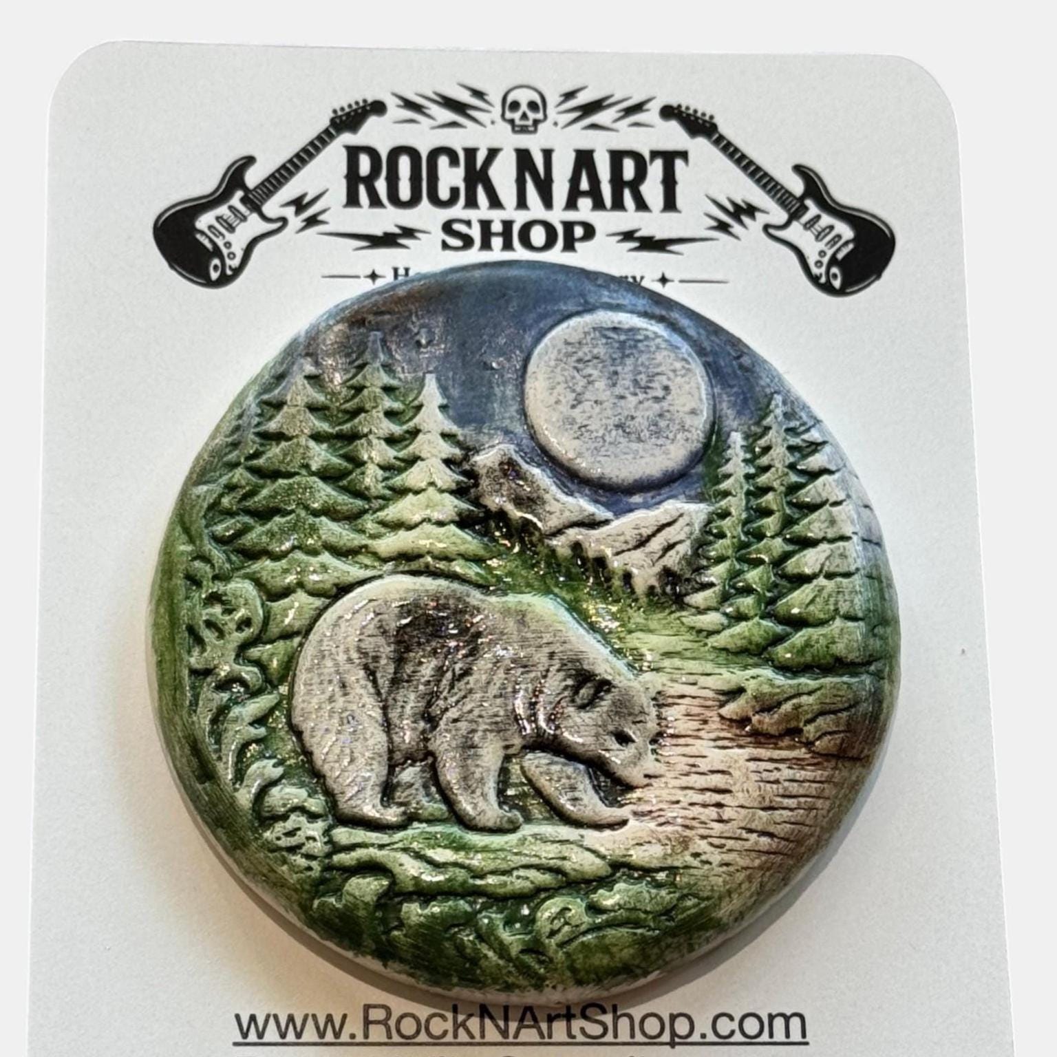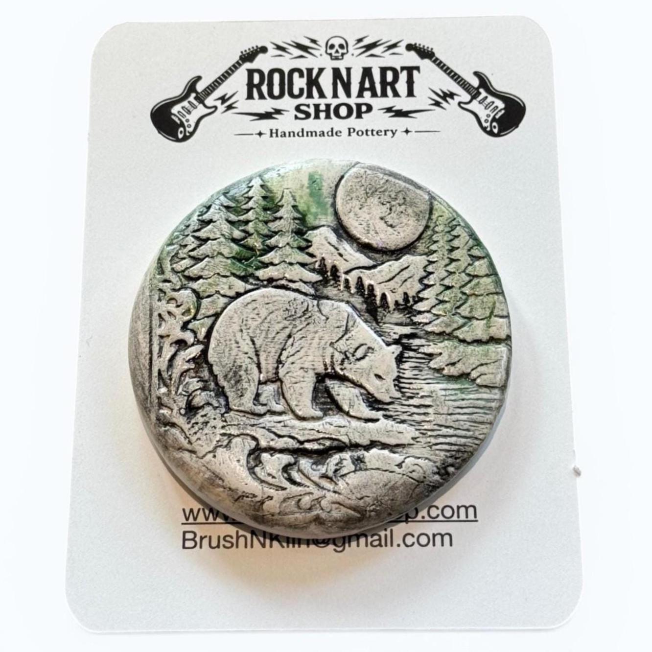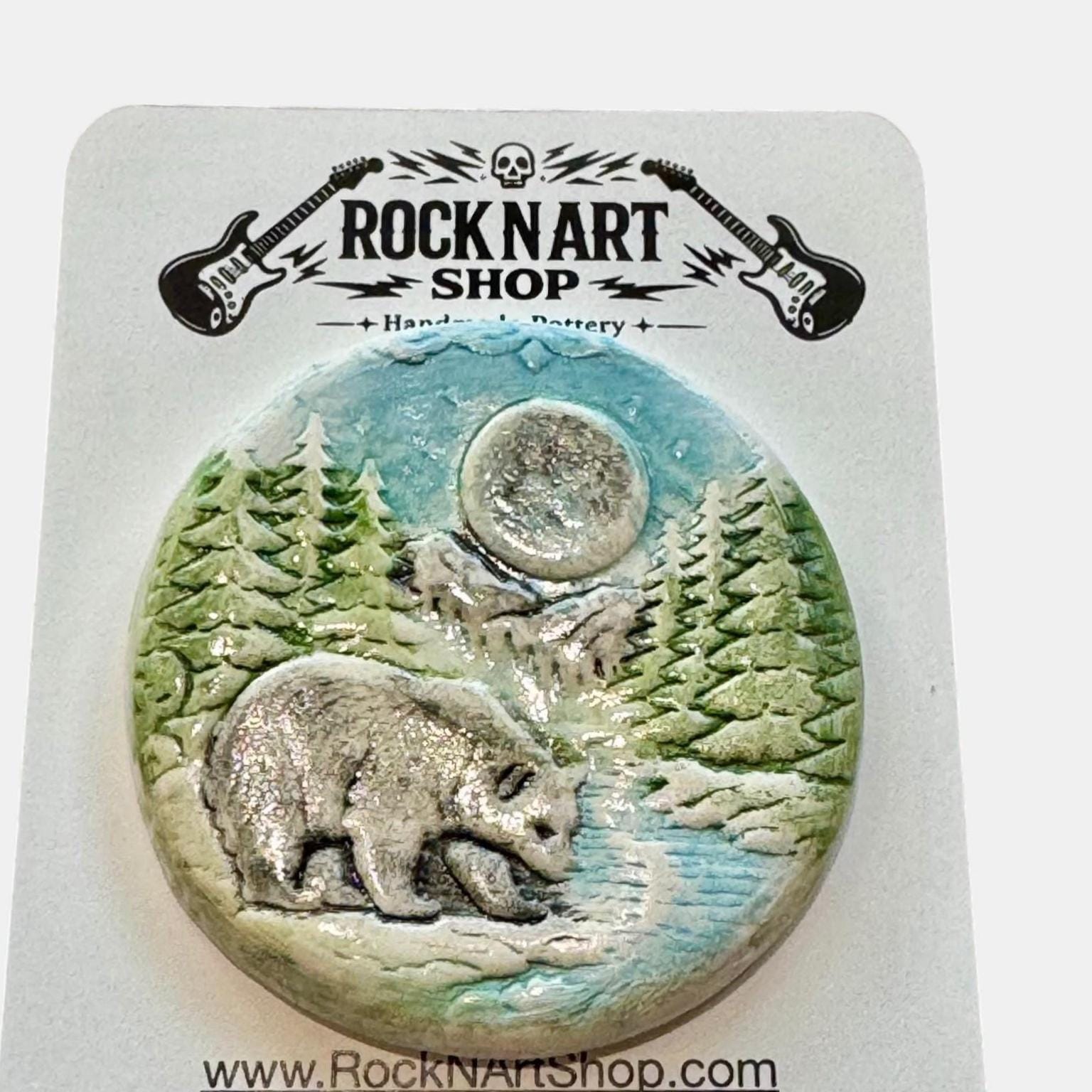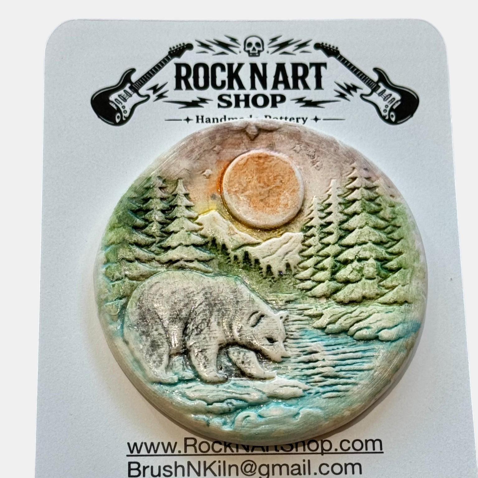 This handmade porcelain magnet features a peaceful mountain scene with a black bear, pine trees, and a flowing river—capturing the quiet beauty of nature in a small, detailed work of art.