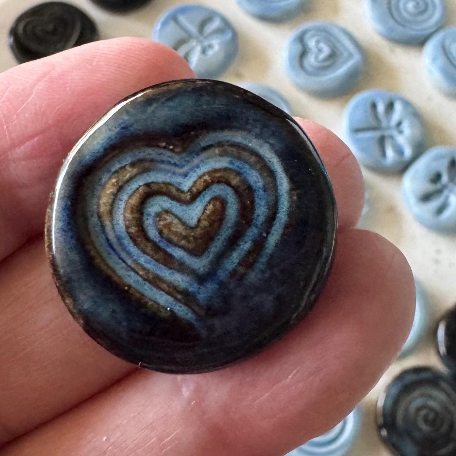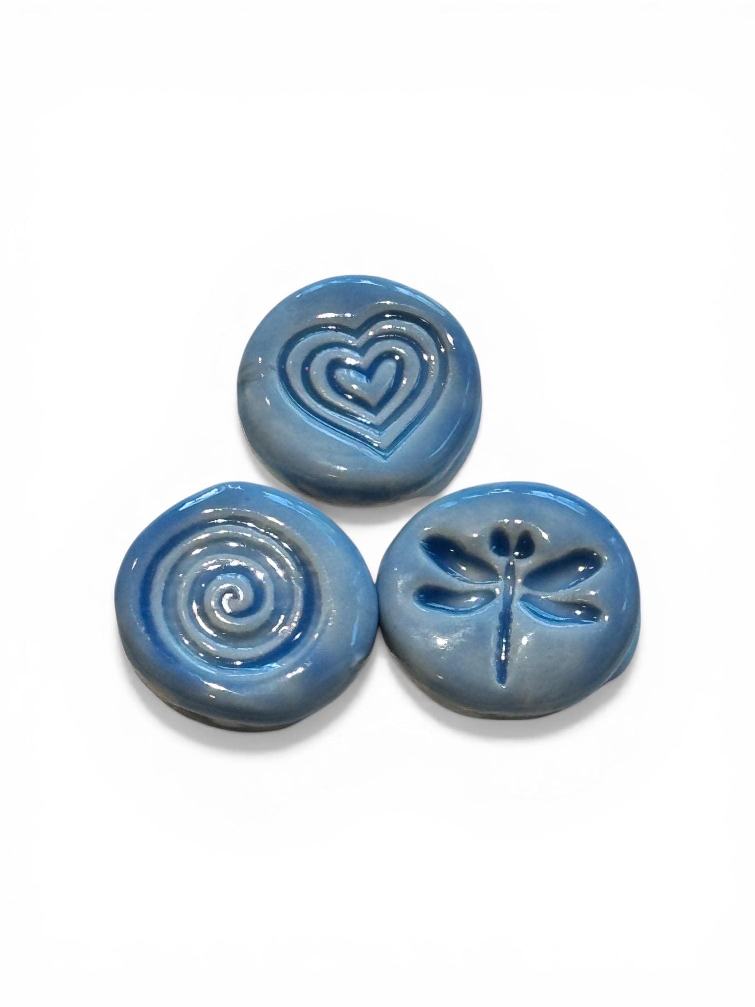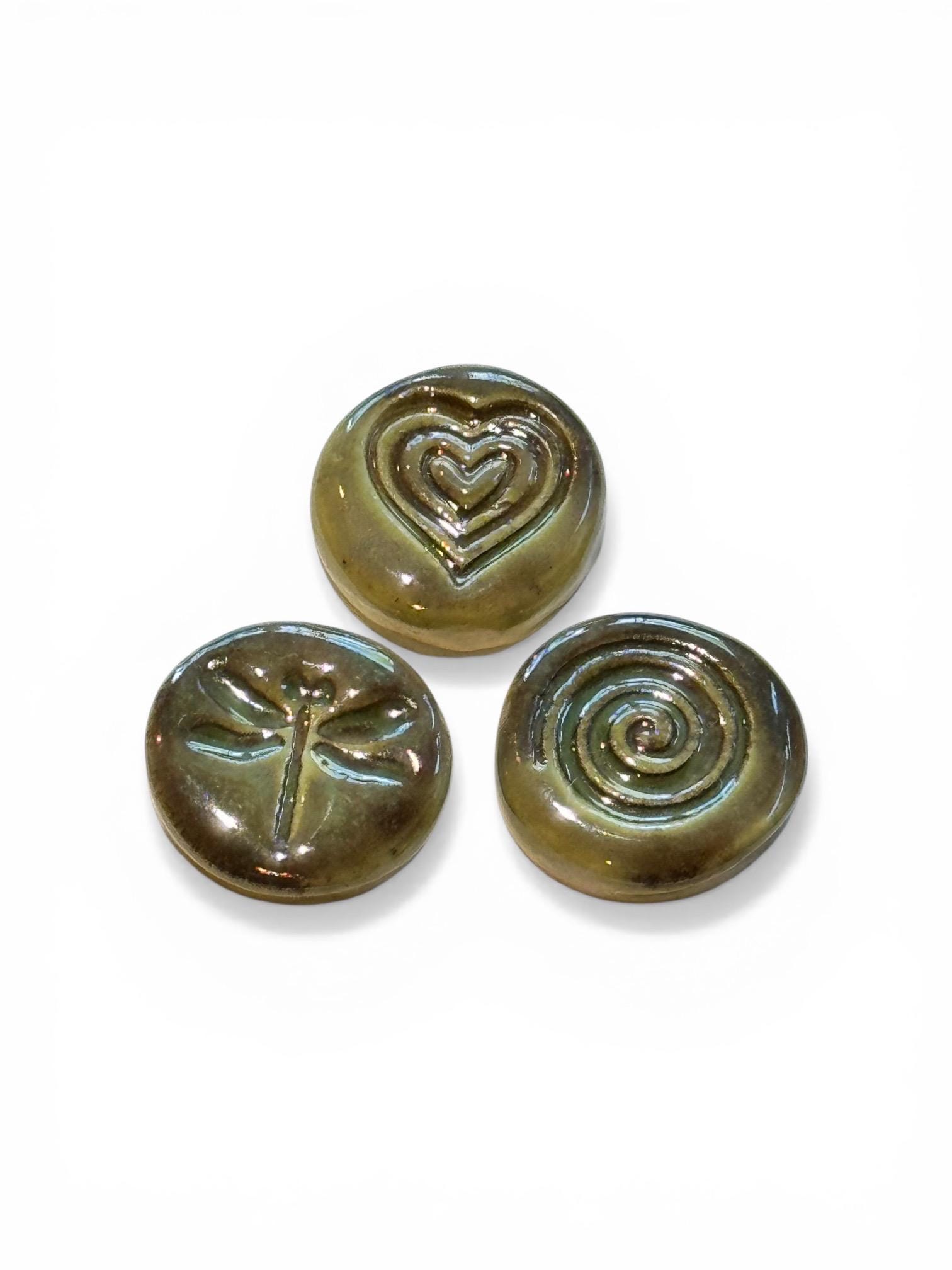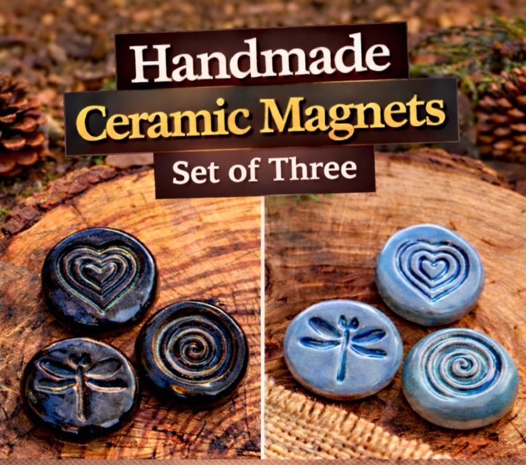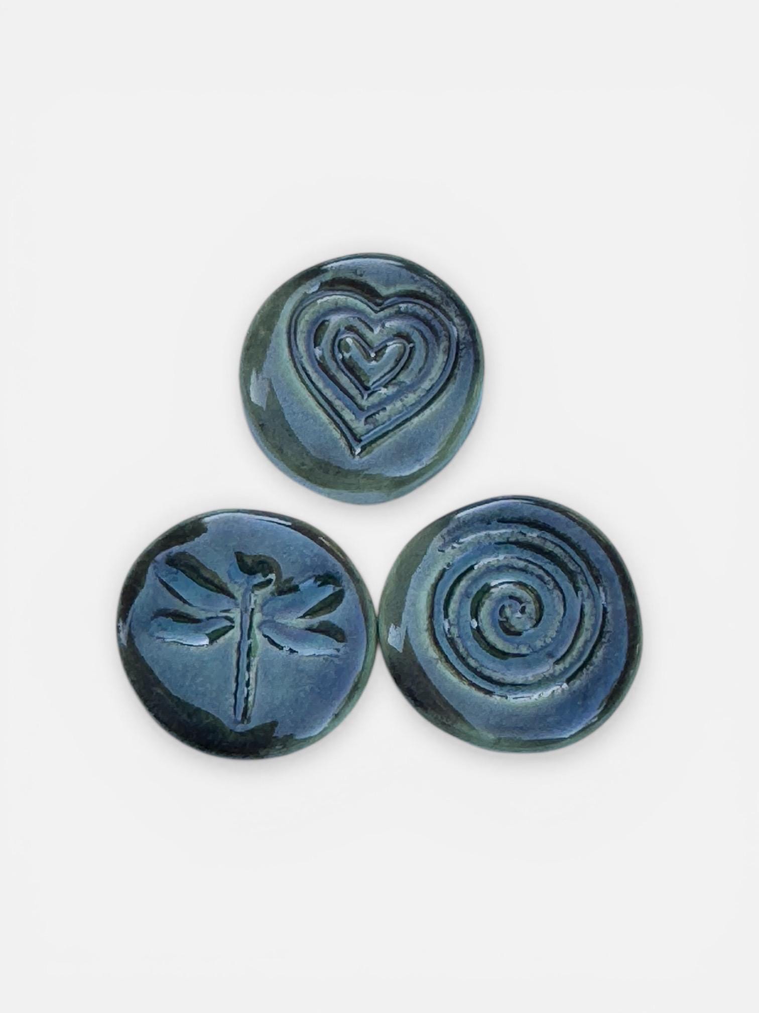 Set of 3, handmade ceramic magnets featuring an embossed heart, dragonfly and swirl designs, each one uniquely finished with layered glaze and subtle texture.